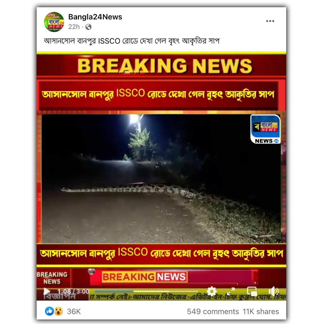 বাংলা২৪ নিউজ নামের একটি ফেসবুক পেজ থেকে এই ভিডিওটি শেয়ার কর হয়েছে। ভিডিওটি শেয়ার করে লেখা হয়েছে, "আসানসোল বানপুর ISSCO রোডে দেখা গেল বৃহৎ আকৃতির সাপ।"