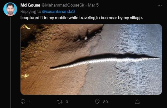 তবে সুশান্তর টুইটের তলায় আমরা অন্য এক ব্যবহারকারীর একটি টুইট দেখতে পাই। তিনি ওই সাপটির তোলা একটি টপ শট নিজের টুইটে শেয়ার করেন। তিনি জানান যে এই সাপটিকে নাকি তিনি অন্ধ্র প্রদেশ ও কর্ণাটকের মাঝে কোনও জঙ্গলে দেখেছিলেন।