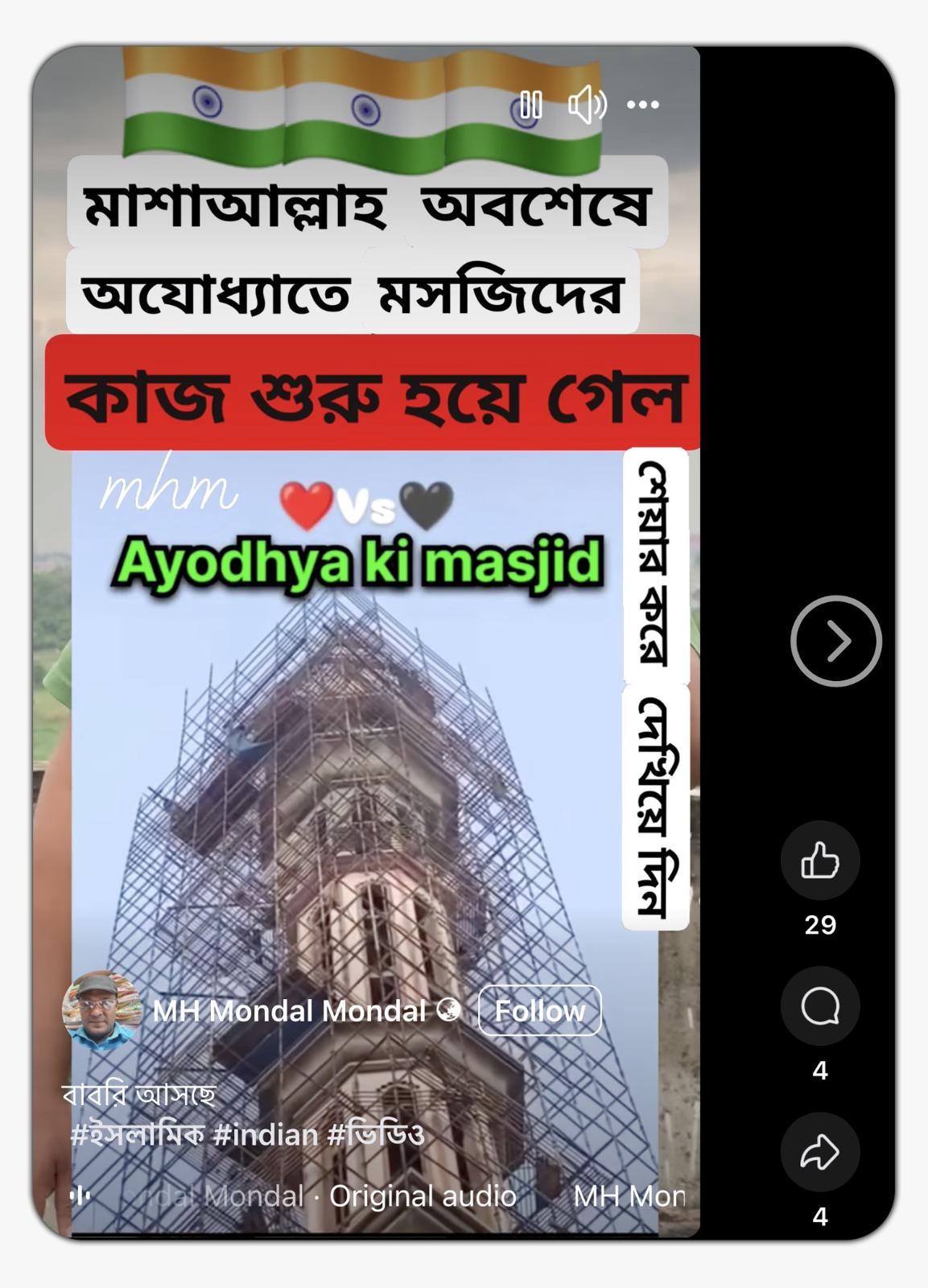 ভিডিওটি শেয়ার করে দাবি করা হচ্ছে, অবশেষে অযোধ্যায় সুপ্রিম কোর্টের দেওয়া জমিতে তৈরি হচ্ছে বাবরি মসজিদ। উদাহরণস্বরূপ, এক ফেসবুক ব্যবহারকারী ভাইরাল ভিডিওটি শেয়ার করে এর ফ্রেমের উপরে লিখেছেন, “মাশাআল্লাহ অবশেষে অযোধ্যাতে মসজিদের কাজ শুরু হয়ে গেল।” পাশাপাশি, ভিডিওর ক্যাপশনে তিনি লিখেছেন, “বাবরি আসছে ।” (সব বানান অপরিবর্তিত)
