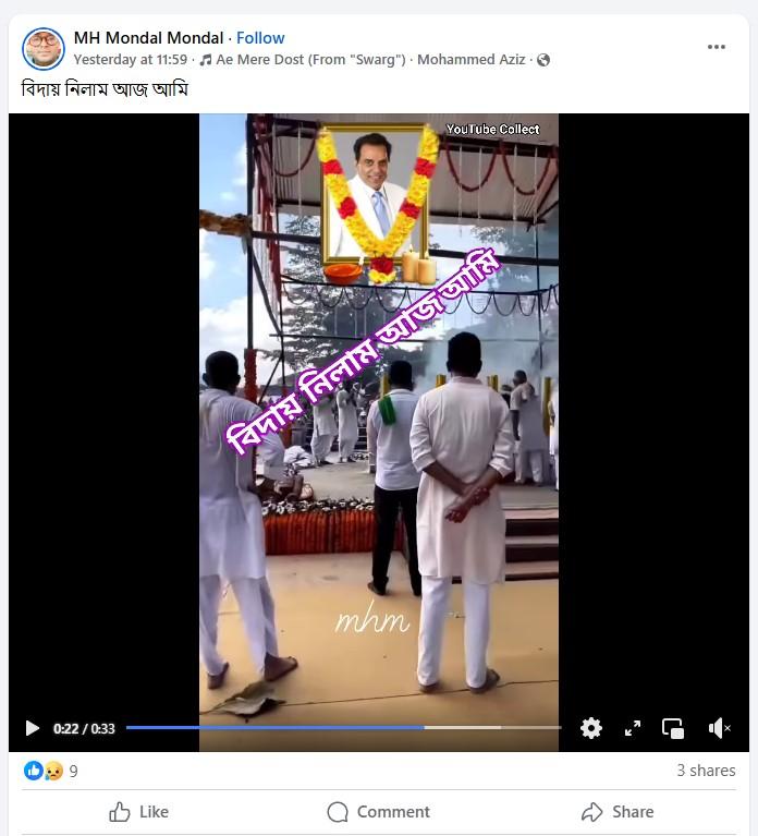 যেখানে শ্মশানে চিতার ওপরে কোনও একজনের দেহ রেখে শেষকৃত্যের প্রস্তুতি নেওয়া হচ্ছে। অন্যদিকে চিতার চার পাশ ঘিরে রেখেছেন হাজার হাজার মানুষ। তাঁদের মধ্যে অনেকেই ভেঙে পড়েছেন কান্নায়। সরাসরি উল্লেখ না করা হলেও ভিডিও-র ফ্রেমের উপরে অভিনেতা ধর্মেন্দ্রর একটি ছবি যুক্ত করে দাবি করা হয়েছে, সেটি কিংবদন্তি বলিউড অভিনেতা ধর্মেন্দ্রর শেষকৃত্যের দৃশ্য। উদাহরণস্বরূপ, এক ফেসবুক ব্যবহারকারী ভাইরাল ভিডিওটি শেয়ার করে লিখেছেন, “বিদায় নিলাম আজ আমি।”