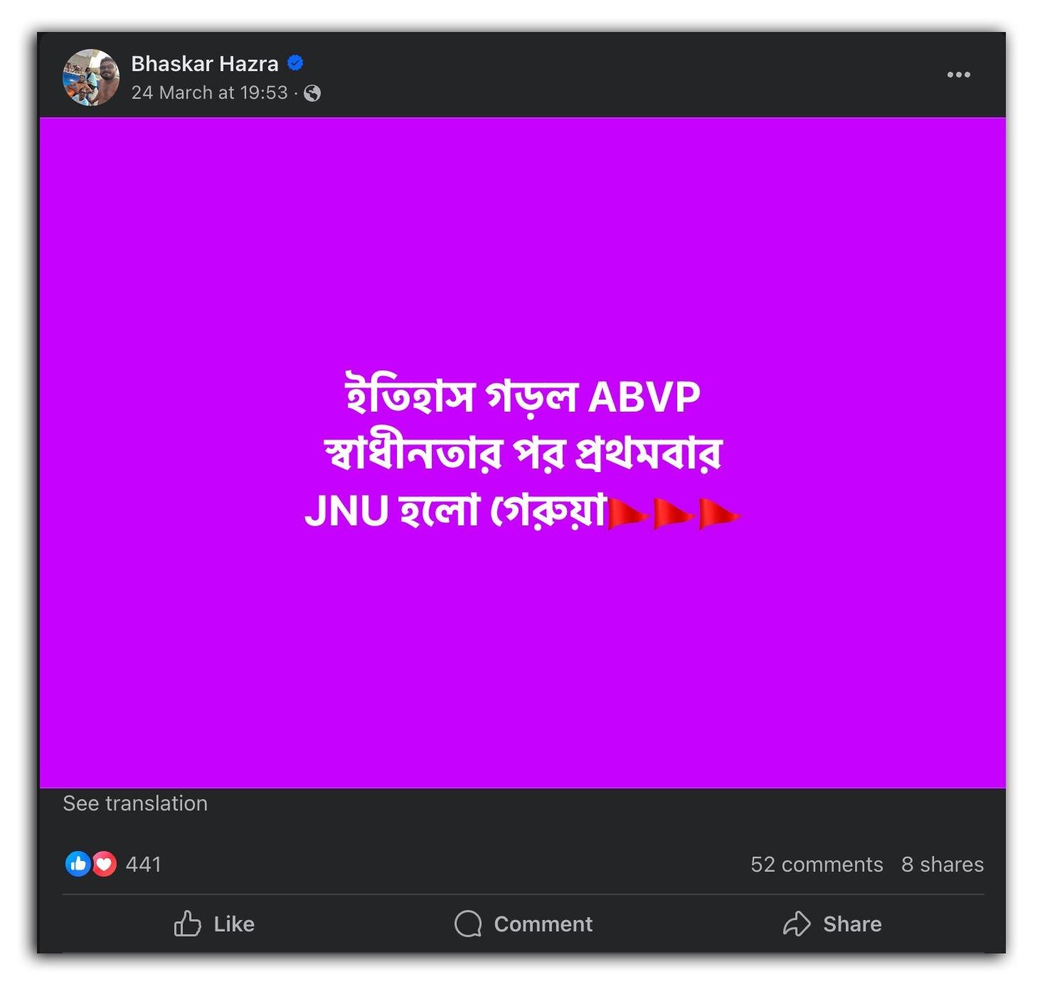 এরই মধ্যে সোশ্যাল মিডিয়ায় ভাইরাল হচ্ছে জওহরলাল নেহরু বিশ্ববিদ্যালয়ের ছাত্র সংসদ নির্বাচনকে কেন্দ্র করে একটি বিশেষ ধরনের পোস্ট। যেখানে দাবি করা হচ্ছে, স্বাধীনতার পর এই প্রথম জেএনইউকে গেরুয়া করে ইতিহাস গড়েছে এবিভিপি। সরাসরি উল্লেখ না করা হলেও, পোস্টগুলিতে এমনটাই ইঙ্গিত করা হয়েছে যে, এবছর অনুষ্ঠিত জওহরলাল নেহরু বিশ্ববিদ্যালয়ের ছাত্র সংসদ নির্বাচনে জয়ী হয়েছে এবিভিপি।