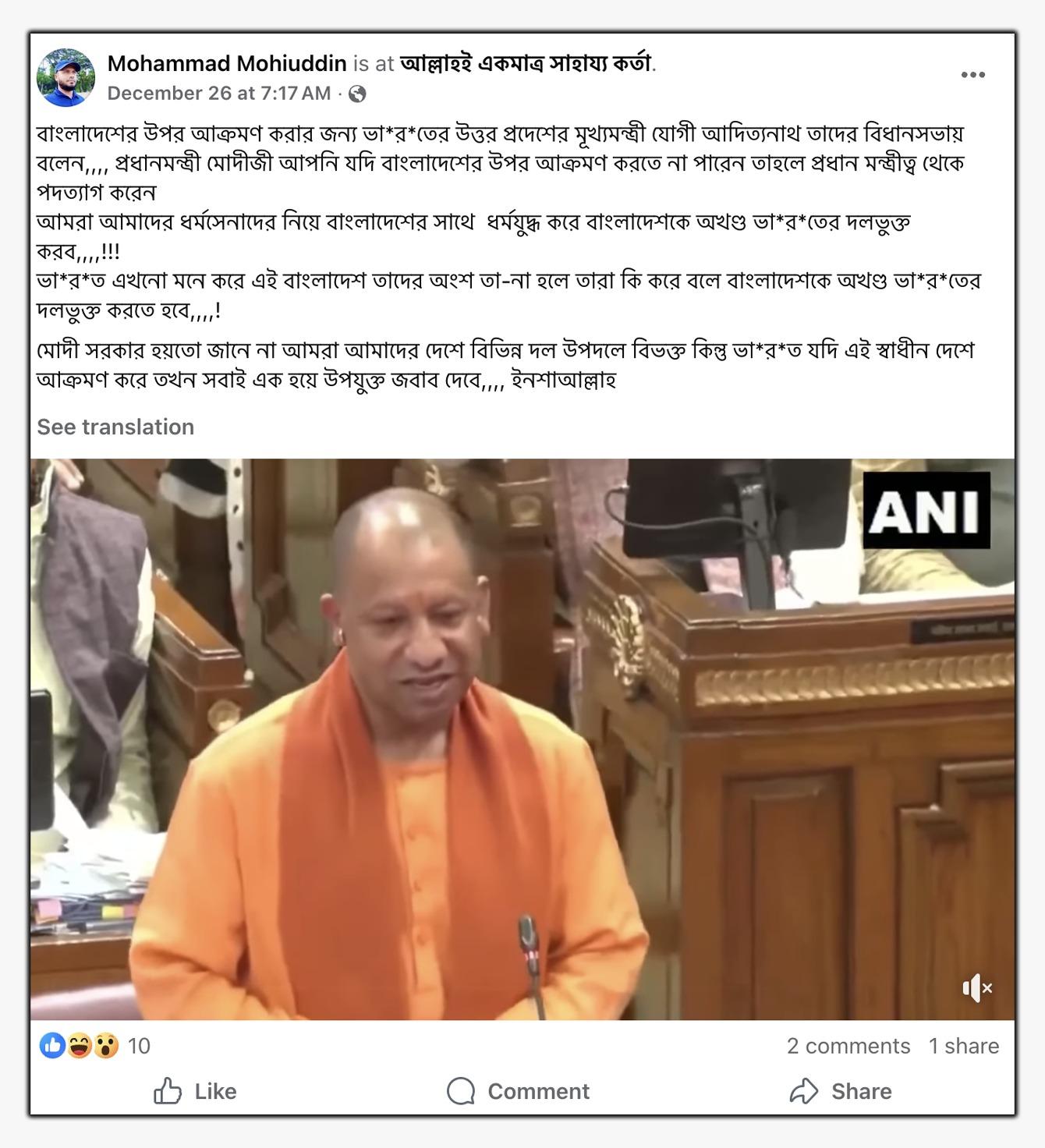 উদাহরণস্বরূপ, এক ফেসবুক ব্যবহারকারী ভাইরাল ভিডিওটি শেয়ার করে লিখেছেন, “বাংলাদেশের উপর আক্রমণ করার জন্য ভা*র*তের উত্তর প্রদেশের মূখ্যমন্ত্রী যোগী আদিত্যনাথ তাদের বিধানসভায় বলেন,,,, প্রধানমন্ত্রী মোদীজী আপনি যদি বাংলাদেশের উপর আক্রমণ করতে না পারেন তাহলে প্রধান মন্ত্রীত্ব থেকে পদত্যাগ করেন।” (সব বানান অপরিবর্তিত)