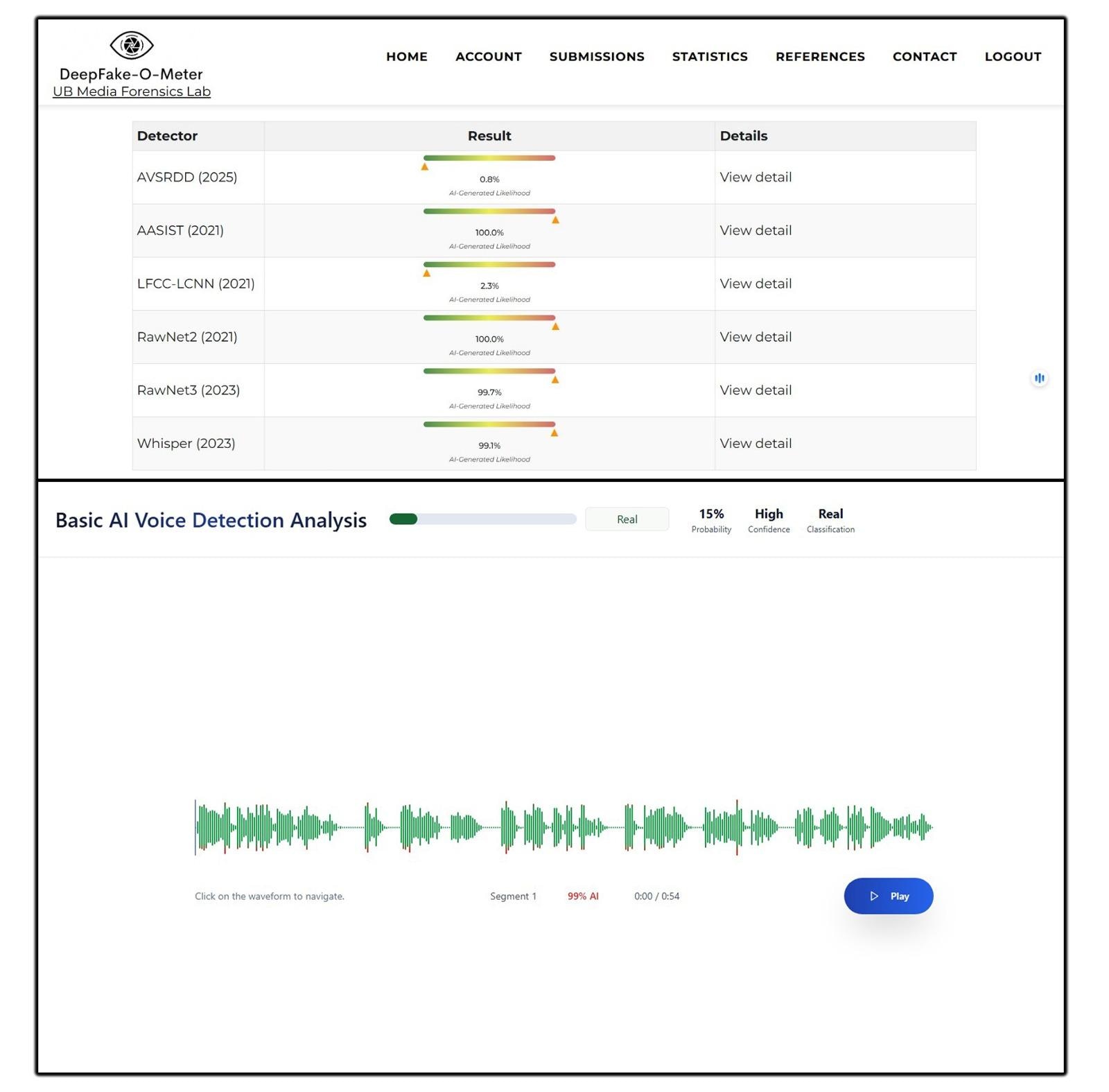 যা থেকে সন্দেহ তৈরি হয় যে ভাইরাল ভিডিওটির মধ্যে কোনও অসঙ্গতি থাকতেও পারে। কিংবা ভিডিওতে যোগী আদিত্যনাথের কণ্ঠস্বর এইআই বা কৃত্রিম বুদ্ধিমত্তার সাহায্যে বিকৃত করা হতেও। তাই বিষয়টি সম্পর্কে নিশ্চিত হতে এরপর আমরা ভাইরাল ভিডিও থেকে যোগী আদিত্যনাথের কণ্ঠস্বরের অডিও ক্লিপটি নিয়ে TruthScan এবং DEEPFAKE-O-METER নামক দুটি এআই যাচাইকারী ওয়েবসাইটে পরীক্ষা করি। ওয়েবসাইট দুটিই নিশ্চিতভাবে জানিয়েছে যে ভাইরাল ভিডিওতে ব্যবহৃত যোগী আদিত্যনাথের কণ্ঠস্বরটি ফেক অর্থাৎ সেটি এইআই বা কৃত্রিম বুদ্ধিমত্তার সাহায্যে বিকৃত করা হয়েছে।