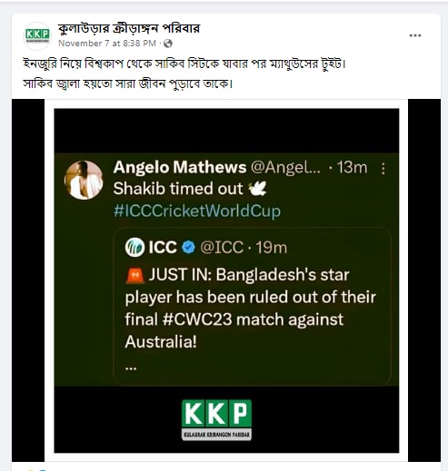 এই পরিস্থিতিতে সোশ্যাল মিডিয়ায় অ্যাঞ্জেলো ম্যাথিউজের নাম-সহ একটি এক্স পোস্ট ভাইরাল হয়েছে। যা পোস্ট করে অনেকেই দাবি করেছেন যে, শ্রীলঙ্কার অল রাউন্ডার সাকিব-আল হাসানের ইনজুরি নিয়ে এক্স হ্যান্ডেলে কটাক্ষ করেছেন।