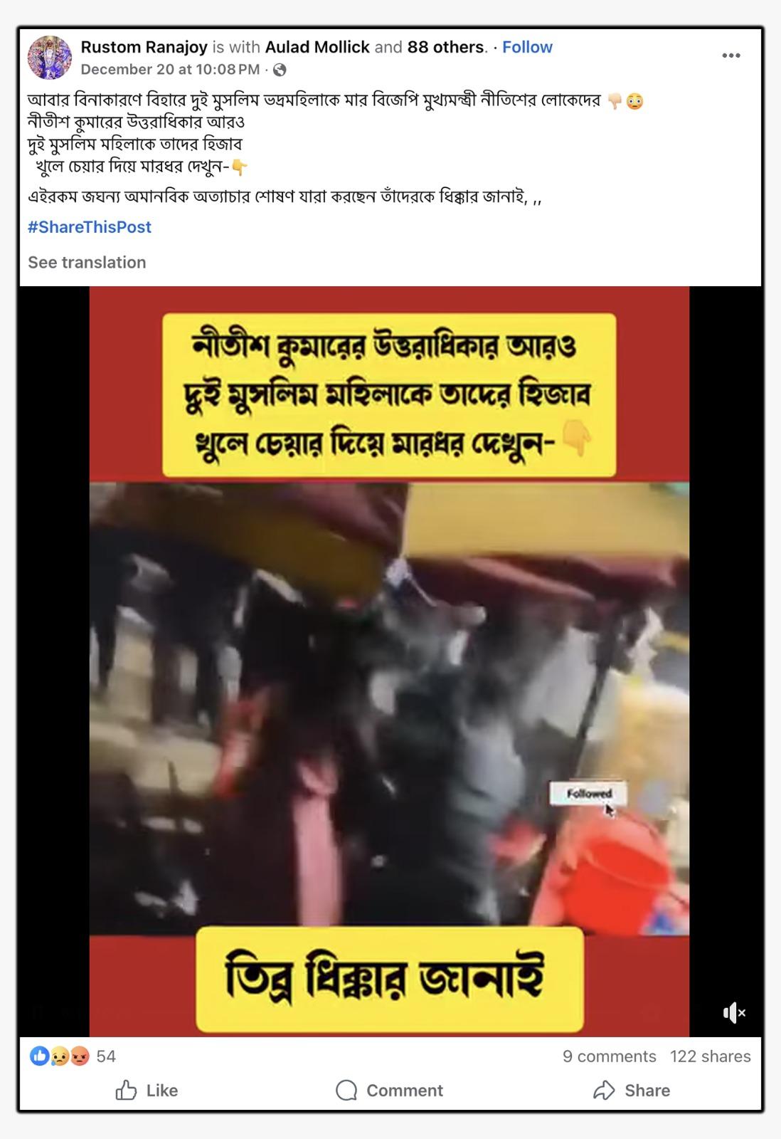 ভিডিওটি শেয়ার করে দাবি করা হচ্ছে, হিজাব পরার কারণে বিহারে বিজেপি এবং মুখ্যমন্ত্রী নীতীশ কুমারের সমর্থকরা দুই মুসলিম মহিলাকে মারধর করেছে। উদাহরণস্বরূপ, এক ফেসবুক ব্যবহারকারী ভাইরাল ভিডিওটি শেয়ার করে লিখেছেন, “আবার বিনাকারণে বিহারে দুই মুসলিম ভদ্রমহিলাকে মার বিজেপি মুখ্যমন্ত্রী নীতিশের লোকেদের। নীতীশ কুমারের উত্তরাধিকার আরও দুই মুসলিম মহিলাকে তাদের হিজাব খুলে চেয়ার দিয়ে মারধর দেখুন।” (সব বানান অপরিবর্তিত)