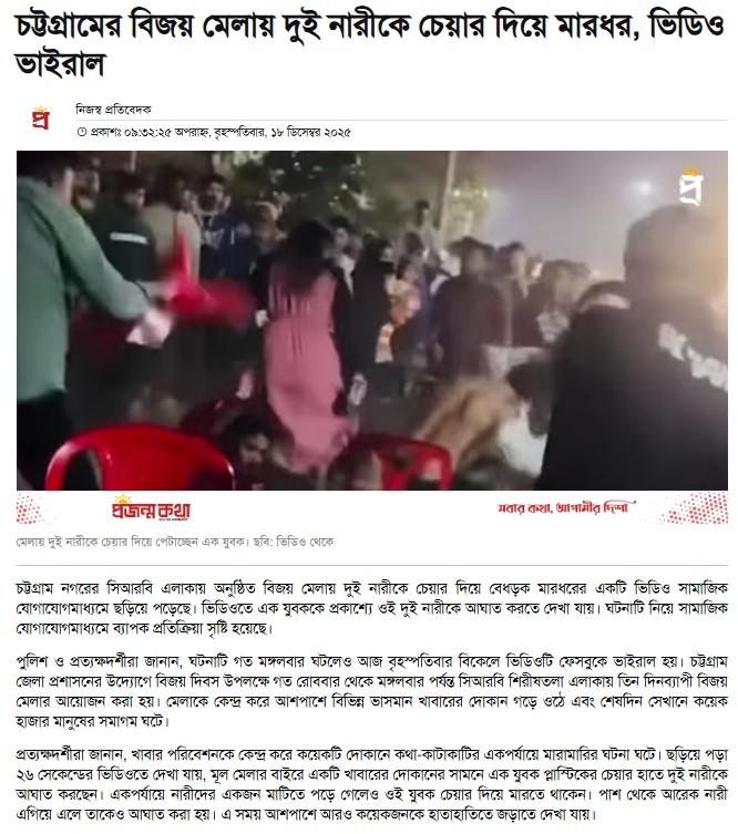 এরপর এই সংক্রান্ত পরবর্তী অনুসন্ধান চালালে ভাইরাল ভিডিও-র স্ক্রিনশট-সহ প্রথম আলো-সহ একাধিক বাংলাদেশি সংবাদমাধ্যমে এই সংক্রান্ত একটি প্রতিবেদন পাওয়া যায়। সেই সব প্রতিবেদন থেকে জানা যায়, বাংলাদেশের বিজয় দিবস উপলক্ষে চলতি বছরের ১৬ ডিসেম্বর চট্টগ্রামের সিআরবি শিরীষতলা এলাকায় তিনদিনের বিজয় মেলার আয়োজন করা হয়। সেই মেলায় খাবার পরিবেশনকে কেন্দ্র করে কয়েকটি দোকানে কথা-কাটাকাটির এক পর্যায়ে মারামারির ঘটনা ঘটে। এই সময় এক যুবক সেখানে উপস্থিত দুই মহিলাকে চেয়ার দিয়ে মারধর করে।