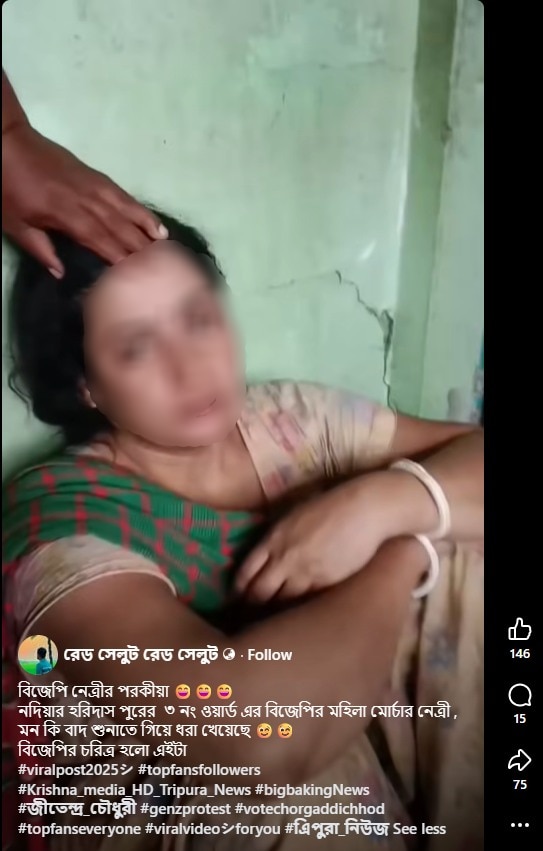 এহেন দাবির সপক্ষে যে ভিডিওটি পোস্ট করা হয়েছে সেখানে এক মহিলাকে ভীত অবস্থায় বসে থাকতে দেখা যাচ্ছে, এবং বেশ কয়েকজন পুরুষ তাঁকে ঘিরে রয়েছেন। ভিডিওটি পোস্ট করে ক্যাপশনে লেখা হয়েছে, "বিজেপি নেত্রীর পরকীয়া। নদিয়ার হরিদাস পুরের ৩ নং ওয়ার্ড এর বিজেপির মহিলা মোর্চার নেত্রী , মন কি বাদ শুনাতে গিয়ে ধরা খেয়েছে। বিজেপির চরিত্র হলো এইটা।”