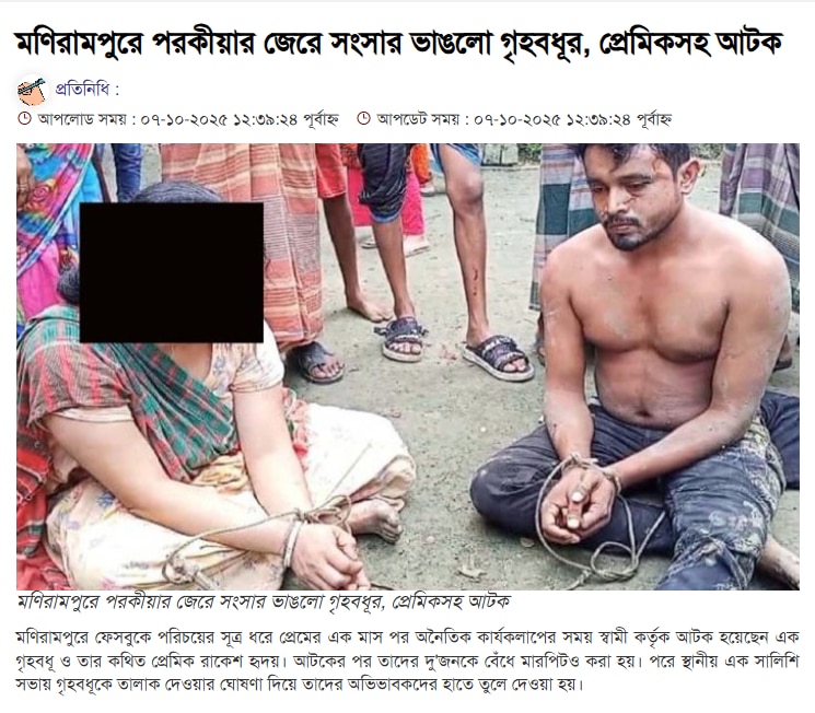 রিপোর্টগুলোয় লেখা হয়, বিবাহিত ওই মহিলার সঙ্গে যে যুবক ধরা পড়েছে তার নাম রাকেশ হৃদয়। ফেসবুকে পরিচয় থেকে তাদের প্রেম শুরু হয়। গত শনিবার দুর্গাপুজো পরবর্তী অনুষ্ঠানে যখন ওই মহিলার স্বামী ব্যস্ত ছিলেন, তখন রাকেশ এসে ঘরে ঢোকে। কিন্তু এই সময় নিজের স্ত্রীকে পরপুরুষের সঙ্গে আপত্তিকর অবস্থায় দেখে ফেলেন স্বর্ণব্যবসায়ী স্বামী। এরপর ওই দু'জনকে আটক করে স্থানীয়রা, মারধরও করা হয়। পরকীয়ায় লিপ্ত ওই মহিলার ১২ বছর বয়সী একটি কন্যাসন্তান রয়েছে বলে একাধিক রিপোর্টে লেখা হয়েছে।