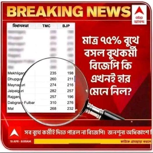 এরই মধ্যে সোশ্যাল মিডিয়া ভাইরাল হয়েছে এবিপি আনন্দের একটি বিশেষ স্ক্রিনশট। সেই স্ক্রিনশটটি ভালো করে লক্ষ্য করলে বোঝা যায় যে, সেটি ১৯ এপ্রিল সকাল ৮টায় এবিপি আনন্দের লাইভ সম্প্রচার থেকে নেওয়া হয়েছে। সেখানে উল্লেখ করা হয়েছে যে, “মাত্র ৭৫% বুথে বসল বুথকর্মী বিজেপি কি এখনই হার মেনে নিল?” পাশাপাশি নিচের চলমান স্ক্রলে লেখা হয়েছে, “সব বুথে কর্মীই দিতে পারল না বিজেপি।” অন্যদিকে সেখানে একটি টেবিল দিয়ে উত্তরবঙ্গের মেখলিগঞ্জ ও রায়গঞ্জ-সহ বেশ কয়েকটি বিধানসভায় তৃণমূল ও বিজেপির পোলিং এজেন্টের সংখ্যার তুলনা করা হয়েছে।