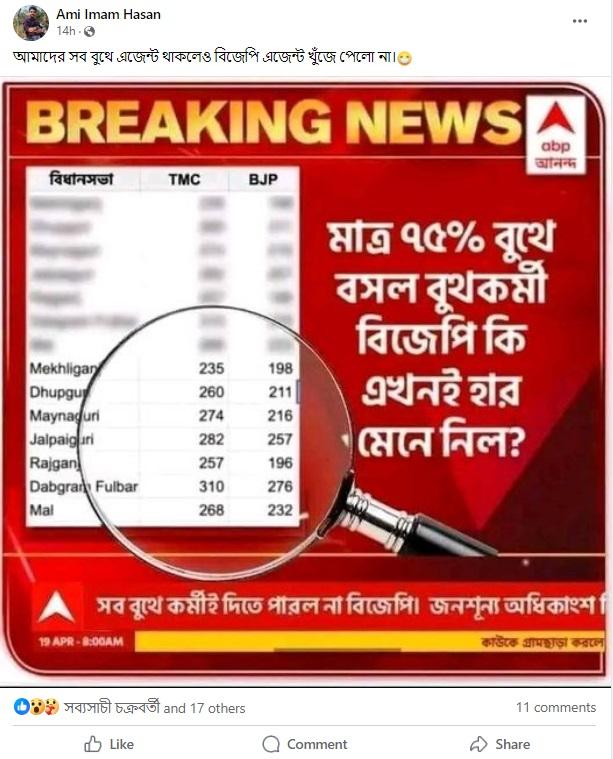 উদাহরণস্বরূপ, এক ফেসবুক ব্যবহারকারী স্ক্রিনশটটি শেয়ার করে ক্যাপশনে লিখেছেন, “আমাদের সব বুথে এজেন্ট থাকলেও বিজেপি এজেন্ট খুঁজে পেলো না।” (ক্যাপশনের বানান অপরিবর্তিত।) এমনই একটি পোস্টের আর্কাইভ এখানে দেখা যাবে। সরাসরি উল্লেখ না করা হলেও ওই ফেসবুক ব্যবহারকারী এটাই ইঙ্গিত করেছেন যে, প্রথম দফার নির্বাচনে উত্তরবঙ্গের ৩টি লোকসভা আসনের ২৫ শতাংশ বুথেই পোলিং এজেন্ট দিতে পারেনি গেরুয়া শিবির।