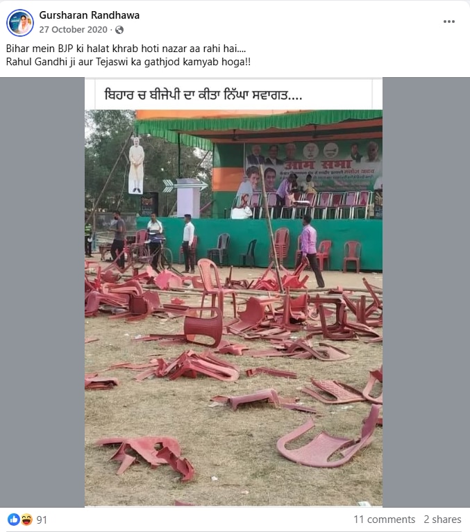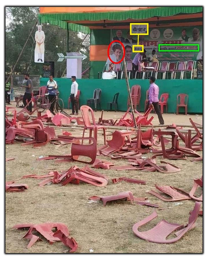 সম্প্রতি একটি ছবি সোশ্যাল মিডিয়ায় বেশ ভাইরাল হয়েছে যেখানে একটি সভামঞ্চের সামনে কতগুলো প্ল্যাস্টিকের চেয়ার ভেঙে পড়ে থাকতে দেখা যাচ্ছে। ছবিটি শেয়ার করে দাবি করা হচ্ছে যে, বিজেপির বিরোধী দলনেতা শুভেন্দু অধিকারী ও বিজেপি সাংসদ সুকান্ত মজুমদারের সভা শেষে বিজেপির গোষ্ঠীদ্বন্দ্বের ছবি উঠে এসেছে।
