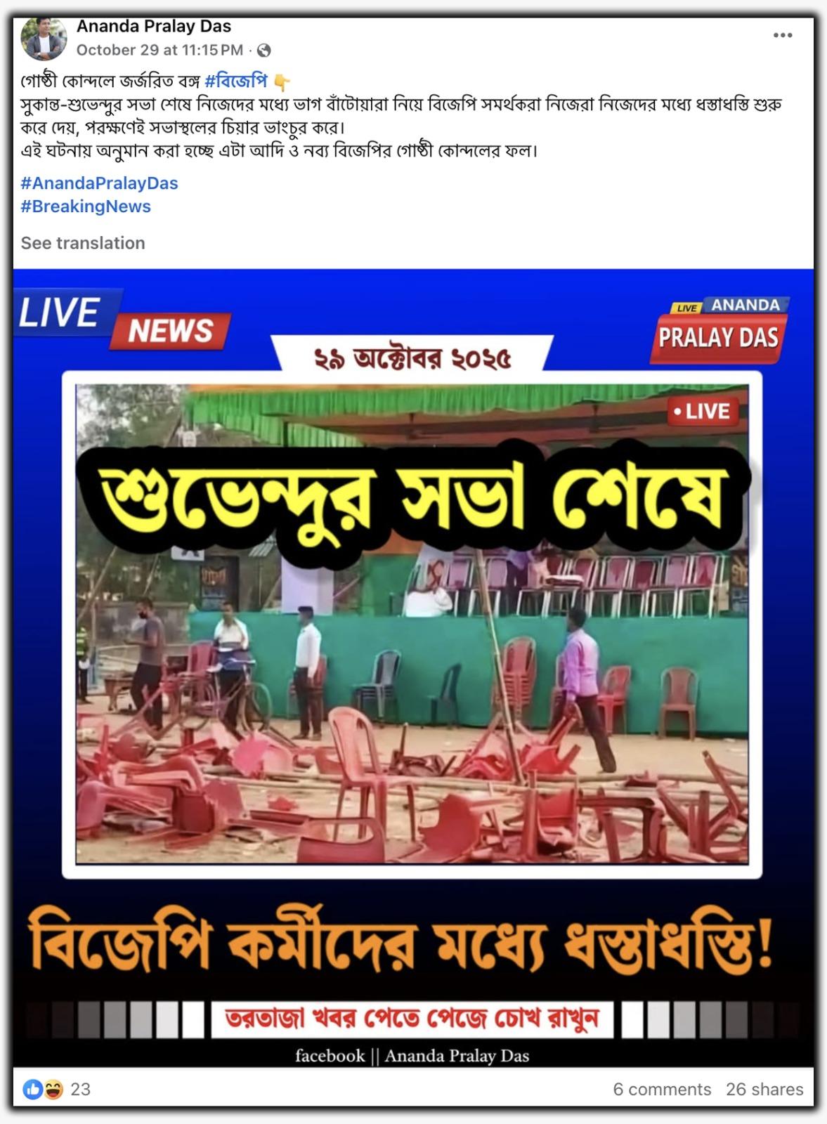 ছবিটি পোস্ট করে ক্যাপশনে লেখা হয়েছে, “গোষ্ঠী কোন্দলে জর্জরিত বঙ্গ #বিজেপি। সুকান্ত-শুভেন্দুর সভা শেষে নিজেদের মধ্যে ভাগ বাঁটোয়ারা নিয়ে বিজেপি সমর্থকরা নিজেরা নিজেদের মধ্যে ধস্তাধস্তি শুরু করে দেয়, পরক্ষণেই সভাস্থলের চিয়ার ভাংচুর করে। এই ঘটনায় অনুমান করা হচ্ছে এটা আদি ও নব্য বিজেপির গোষ্ঠী কোন্দলের ফল।”