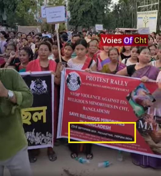 তা ছাড়াও উক্ত ভিডিওতে যে ব্যানার হাতে কিছু মহিলাদের দাঁড়িয়ে থাকতে দেখা যাচ্ছে, সেখানেও স্পষ্টভাবে স্থানের নাম পেঁচারথল, ত্রিপুরা বলেই উল্লেখ করা হয়েছে। সেই সঙ্গে ব্যানারে থাকা লেখা দেখে বোঝা যায়, পার্বত্য চট্টগ্রাম অঞ্চলে সংখ্যালঘু হিন্দু ও বৌদ্ধদের বিরুদ্ধে নির্যাতনের দাবি তুলে এই প্রতিবাদ জানানো হচ্ছিল।
