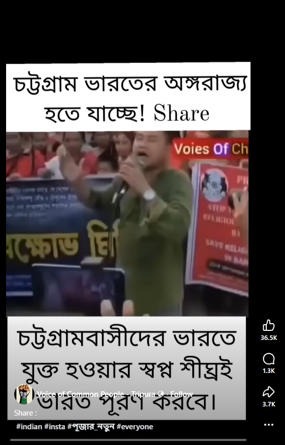 এই ক্লিপটি এমন কিছু ক্যাপশন-সহ সোশ্যাল মিডিয়ায় ছড়িয়ে দেওয়া হয়েছে যা দিয়ে বোঝাতে চাওয়া হচ্ছে যে এই ঘটনাটি বাংলাদেশের চট্টগ্রাম অঞ্চলের এবং সেখানে স্থানীয়রা ভারতের সঙ্গে জুড়তে চেয়ে এই আন্দোলন করছে।