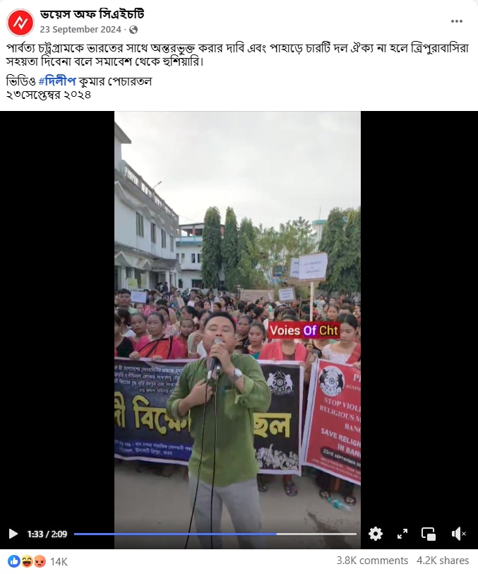 এই ভিডিও-র ক্যাপশনে লেখা হয়, “পার্বত্য চট্রগ্রামকে ভারতের সাথে অন্তরভুক্ত করার দাবি এবং পাহাড়ে চারটি দল ঐক্য না হলে ত্রিপুরাবাসিরা সহয়তা দিবেনা বলে সমাবেশ থেকে হুশিয়ারি। ভিডিও #দিলীপ কুমার, পেচারতল।”