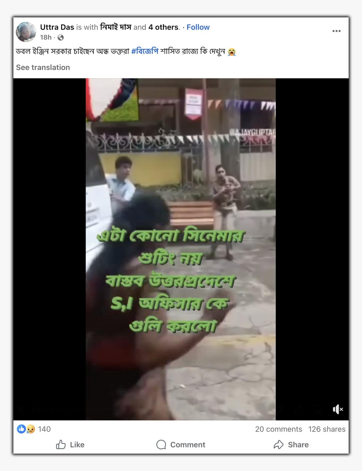 ভিডিওটি শেয়ার করে দাবি করা হচ্ছে, উত্তর প্রদেশের রায়বরেলিতে একজন মহিলা পুলিশ অফিসারকে গুলি করে হত্যা করা হয়েছে। উদাহরণস্বরূপ, এক ফেসবুক ব্যবহারকারী ভাইরাল ভিডিওটি শেয়ার করে লিখেছেন, ডবল ইঞ্জিন সরকার চাইছেন অন্ধ ভক্তরা #বিজেপি শাসিত রাজ্যে কি দেখুন।” পাশাপাশি, ভিডিও-র ফ্রেমের উপর তিনি লিখেছেন, “এটা কোনো সিনেমার শুটিং নয় বাস্তব উত্তরপ্রদেশে S. অফিসার কে গুলি করলো” (সব বানান অপরিবর্তিত)