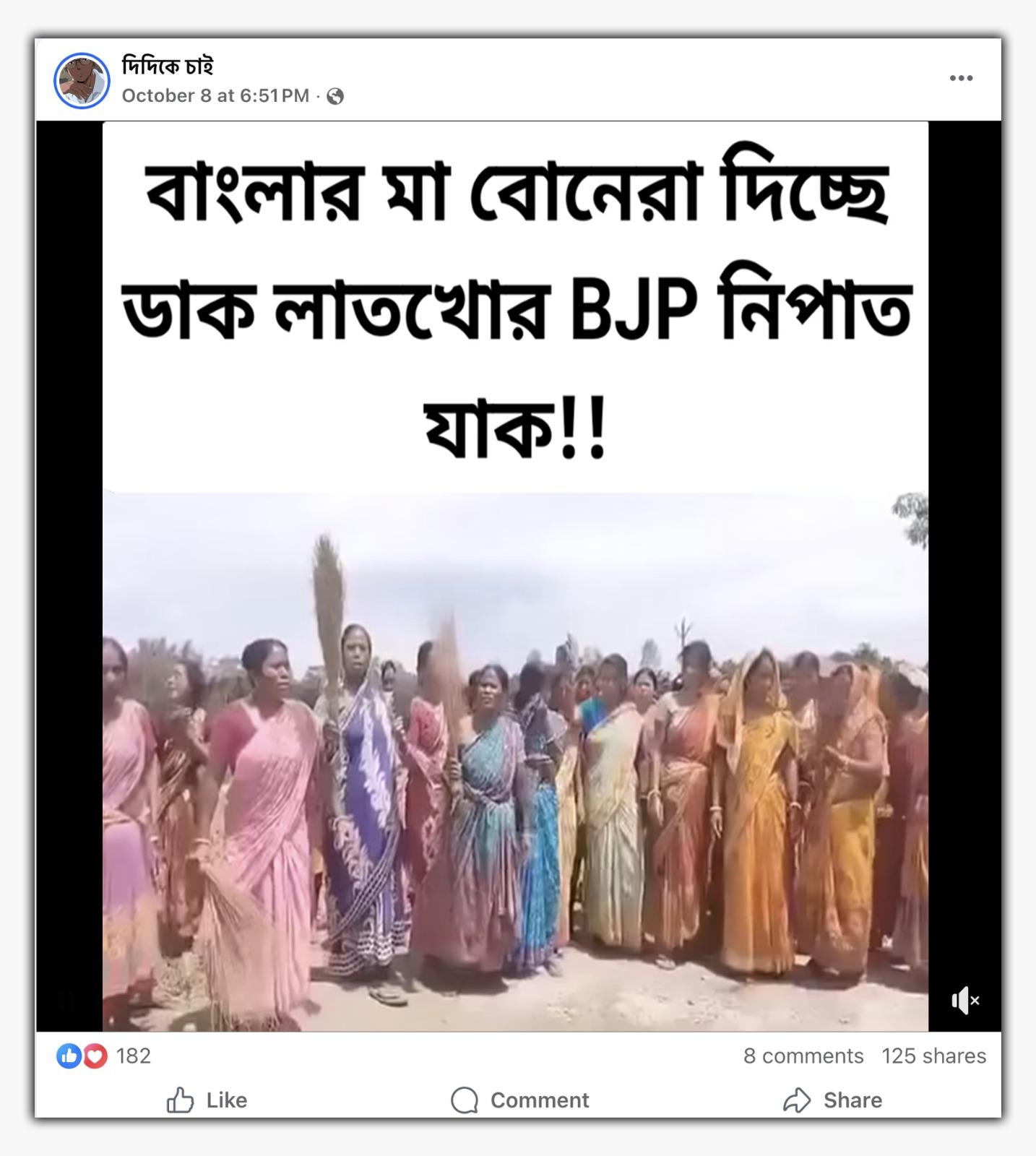 উদাহরণস্বরূপ, এক ফেসবুক ব্যবহারকারী ভাইরাল ভিডিওটি শেয়ার করে সেটির ফ্রেমের লিখেছেন, “বাংলার মা বোনেরা দিচ্ছে ডাক লাতখোর BJP নিপাত যাক!!” (সব বানান অপরিবর্তিত)