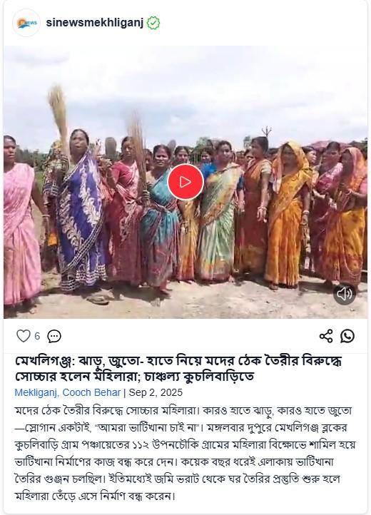 ভাইরাল ভিডিও এবং দাবির সত্যতা জানতে সেটি থেকে একাধিক কিফ্রেম সংগ্রহ করে সেগুলি গুগলে রিভার্স ইমেজ সার্চ করলে ২০২৫ সালের ২ সেপ্টেম্বর পাবলিক অ্যাপের ওয়েবসাইটে এই একই ভিডিওর স্পষ্ট এবং বর্ধিত সংস্করণ-সহ এই সংক্রান্ত একটি বিস্তারিত প্রতিবেদন পাওয়া যায়। সেই প্রতিবেদনে উল্লেখ করা হয়েছে, কোচবিহার জেলার মেখলিগঞ্জ ব্লকের কুচলিবাড়ি গ্রাম পঞ্চায়েতের ১১২ উপনচৌকি গ্রামে নতুন মদের ভাটিখানা নির্মাণের বিরুদ্ধে বিক্ষোভ প্রদর্শন করে স্থানীয় মহিলারা। পাশাপাশি, তারা ভাটিখানা নির্মাণের কাজও বন্ধ করে দেন।