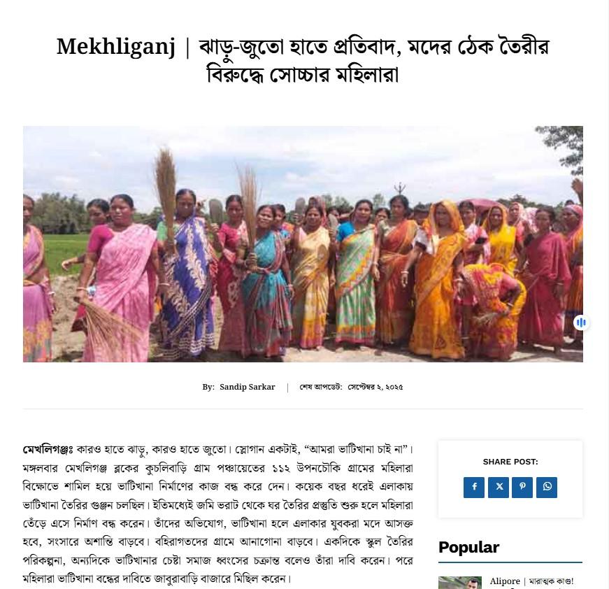 এরপর উক্ত তথ্যের উপরে ভিত্তি করে পরবর্তী অনুসন্ধান চালালে উত্তরবঙ্গ সংবাদ অনলাইনে ভাইরাল ভিডিওর স্ক্রিনশট-সহ এই সংক্রান্ত একটি প্রতিবেদন পাওয়া যায়। সেই প্রতিবেদন থেকে জানা যায়, চলতি বছরের ২ সেপ্টেম্বর মেখলিগঞ্জ ব্লকের কুচলিবাড়ি গ্রাম পঞ্চায়েতের ১১২ উপনচৌকি গ্রামের মহিলারা বিক্ষোভে শামিল হয়ে স্থানীয় একটি ভাটিখানা নির্মাণের কাজ বন্ধ করে দেন। কয়েক বছর ধরেই এলাকায় ভাটিখানা তৈরির গুঞ্জন চলছিল। ইতিমধ্যেই জমি ভরাট থেকে ঘর তৈরির প্রস্তুতি শুরু হলে গ্রামের মহিলারা মিলিত হয়ে নির্মাণ কাজ বন্ধ করেন। তাঁদের অভিযোগ, ভাটিখানা তৈরি হলে এলাকার যুবকরা মদে আসক্ত হয়ে পড়বে। এবং এর জেরে সংসারেও অশান্তি বাড়বে। পাশাপাশি, গ্রামে বহিরাগতদেরো আনাগোনা বাড়বে। সেই কারণেই তাদের এই বিক্ষোভ।