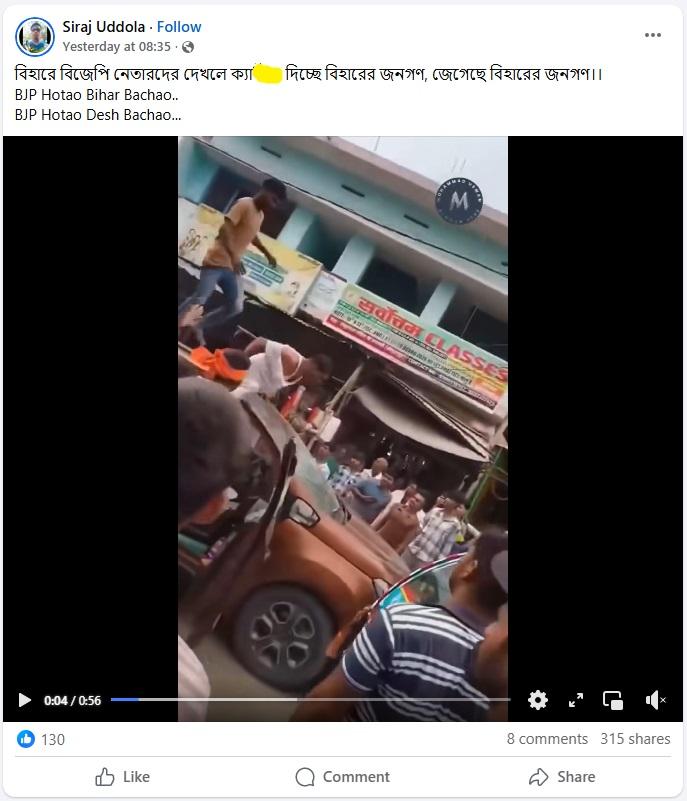 ভিডিওটি শেয়ার করে দাবি করা হচ্ছে, বিহারে ভোট প্রচারে যাওয়া বিজেপি নেতাদের বেধড়ক মারধরের পাশাপাশি তাদের গাড়ি ভাঙচুর করছে সে রাজ্যের সাধারণ মানুষ। উদাহরণস্বরূপ, এক ফেসবুক ব্যবহারকারী ভাইরাল ভিডিওটি শেয়ার করে লিখেছেন, “বিহারে বিজেপি নেতারদের দেখলে ক্যা** দিচ্ছে বিহারের জনগণ, জেগেছে বিহারের জনগণ।।” (সব বানান অপরিবর্তিত)