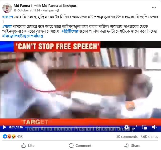 ভিডিওটি শেয়ার করে দাবি করা হচ্ছে, সম্প্রতি বিজেপির শাসনকালে সুপ্রিম কোর্টের প্রবীণ আইনজীবী প্রশান্ত ভূষণের উপর হামলা চালিয়েছে বিজেপি নেতারা। উদাহরণস্বরূপ, এক ফেসবুক ব্যবহারকারী ভাইরাল ভিডিওটি শেয়ার করে লিখেছেন, “#দেশে এসব কি চলছে, সুপ্রিম কোর্টের সিনিয়র অ্যাডভোকেট প্রশান্ত ভূষণের উপর হামলা, বিজেপি নেতার । #যারা শাসকের চেয়ারে বসে আছে তারা আইনশৃঙ্খলা রক্ষা করার দায়িত্ব। ক্ষমতায় পাওয়ারের থেকে আইনশৃঙ্খলা কে বুড়ো আঙ্গুল দেখাচ্ছে। #ব্রিটিশের জুতো পালিশ করা দলটা দেশটাকে ধ্বংস করে দিচ্ছে। #বিজেপিহটাওদেশবাঁচাও।” (সব বানান অপরিবর্তিত)