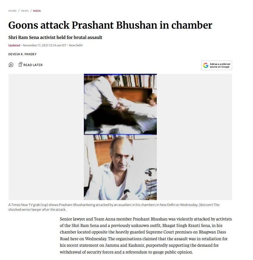 এরপর উক্ত তথ্যের উপরে ভিত্তি করে পরবর্তী অনুসন্ধান চালালে দ্য হিন্দু এবং এনডিটিভি-সহ একাধিক সংবাদমাধ্যমে ভাইরাল ভিডিও এবং এর স্ক্রিনশট-সহ এই সংক্রান্ত বিস্তারিত প্রতিবেদন পাওয়া যায়। সেই সব প্রতিবেদন অনুযায়ী, ২০১১ সালের ১২ অক্টোবর নিজের সুপ্রিম কোর্টের চেম্বারে বসে একটি নিউজ চ্যানেলে লাইভ সাক্ষাৎকার দিচ্ছিলেন আইনজীবী প্রশান্ত ভূষণ। সেই সময় তিন অজ্ঞাত পরিচয় যুবক ফতরে ঢুকে তাঁর উপরে হামলা চালায় এবং তাঁকে মারধর করে। মূলত জম্মু ও কাশ্মীরে নিরাপত্তা বাহিনী প্রত্যাহার এবং জনমত যাচাইয়ের জন্য গণভোট আয়োজনের দাবিকে সমর্থন করার কারণে তাঁর উপরে এই হামলা চালানো হয়েছে বলে জানিয়েছেন প্রশান্ত ভূষণ।