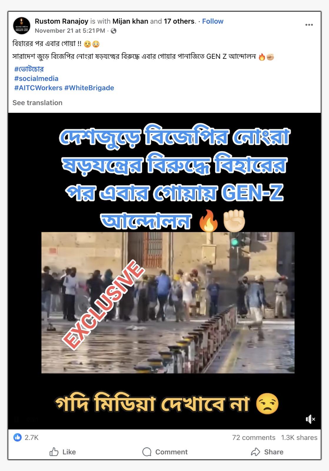 উদাহরণস্বরূপ, এক ফেসবুক ব্যবহারকারী ভাইরাল ভিডিওটি শেয়ার করে সেটির ফ্রেমের উপরে লিখেছেন, “গদি মিডিয়া দেখাবে না। EXCLUSIVE: দেশজুড়ে বিজেপির নোংরা ষড়যন্ত্রের বিরুদ্ধে বিহারের পর এবার গোয়ায় GEN-Z আন্দোলন।” পাশাপাশি, ভিডিও-র ক্যাপশনে লেখা হয়েছে, “বিহারের পর এবার গোয়া !! সারাদেশ জুড়ে বিজেপির নোংরা ষড়যন্ত্রের বিরুদ্ধে এবার গোয়ার পানাজিতে GEN Z আন্দোলন।” (সব বানান অপরিবর্তিত)