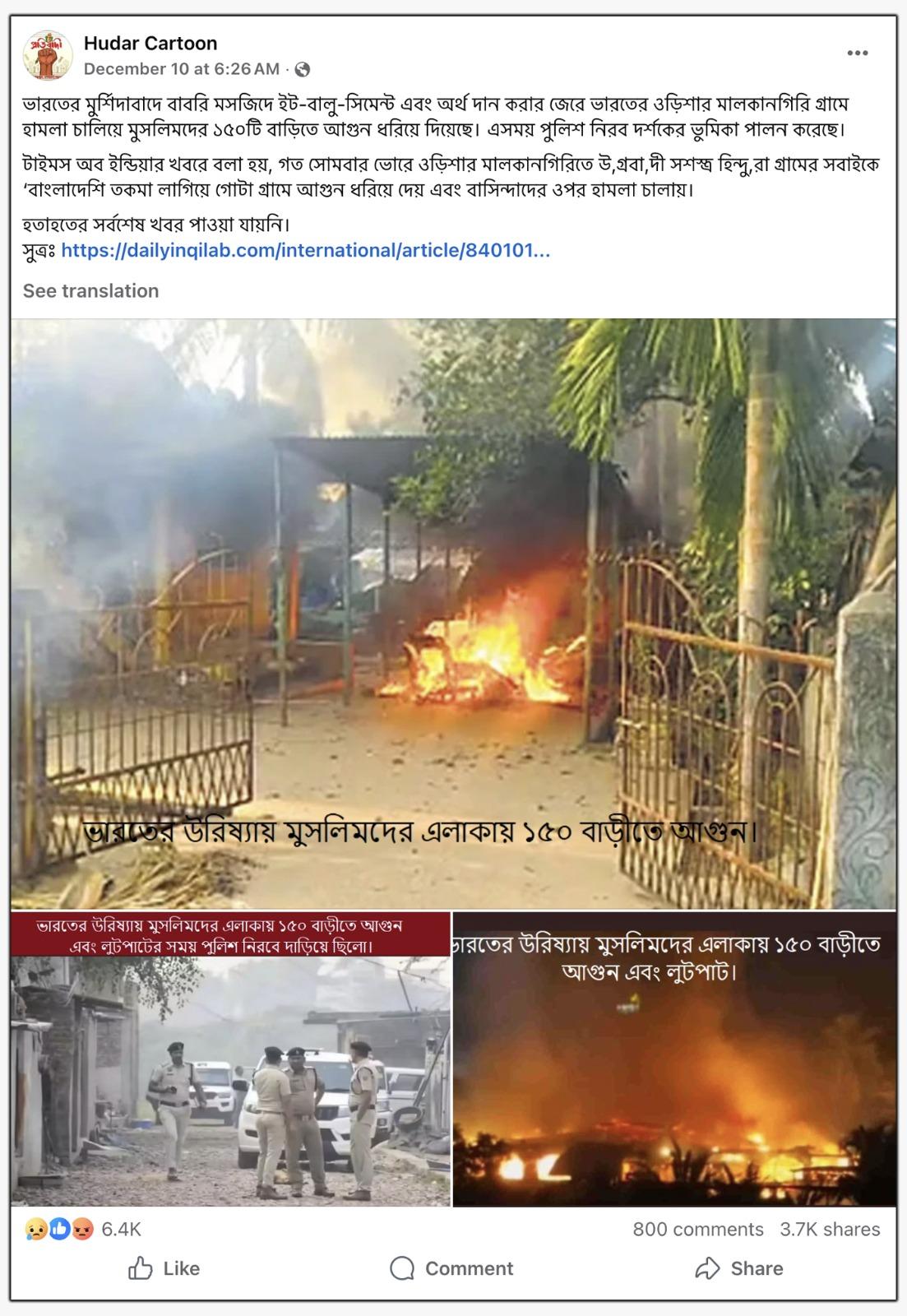 ছবিগুলি শেয়ার করে দাবি করা হচ্ছে, মুর্শিদাবাদে বাবরি মসজিদ তৈরির কাজে অর্থ ও নানা সামগ্রী দান করার কারণে ওড়িশার মালকানগিরিতে মুসলিম সম্প্রদায়ের ১৫০টি বাড়িতে আগুন লাগিয়ে দিয়েছে উগ্র হিন্দুত্ববাদীরা। উদাহরণস্বরূপ, এক ফেসবুক ব্যবহারকারী ভাইরাল ছবিগুলি শেয়ার করে লিখেছেন, “ভারতের মুর্শিদাবাদে বাবরি মসজিদে ইট-বালু-সিমেন্ট এবং অর্থ দান করার জেরে ভারতের ওড়িশার মালকানগিরি গ্রামে হামলা চালিয়ে মুসলিমদের ১৫০টি বাড়িতে আগুন ধরিয়ে দিয়েছে। এসময় পুলিশ নিরব দর্শকের ভুমিকা পালন করেছে।” (সব বানান অপরিবর্তিত)
