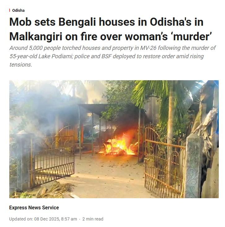 চলতি বছরের ৭ ডিসেম্বর একটি খুনের ঘটনায় জড়িত থাকার অভিযোগে আদিবাসীরা ওড়িশার মালকানগিরিতে প্রায় ২৩০টিরও বেশি বাড়ি এবং দোকান পুড়িয়ে দেয়। তবে পুলিশ নিশ্চিত করেছে যে আক্রান্তরা কেউ মুসলিম সম্প্রদায়ের মানুষ নয়, বরং সকলেই বাঙালি হিন্দু।