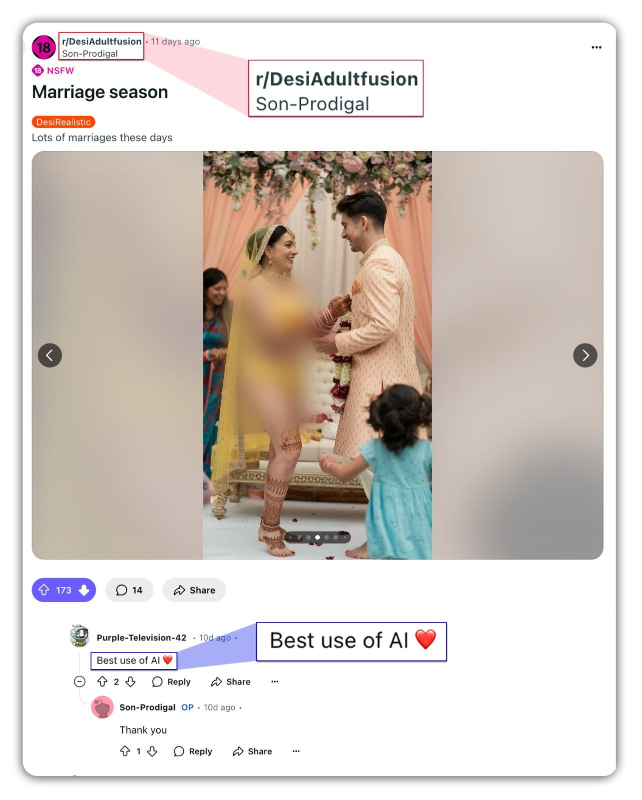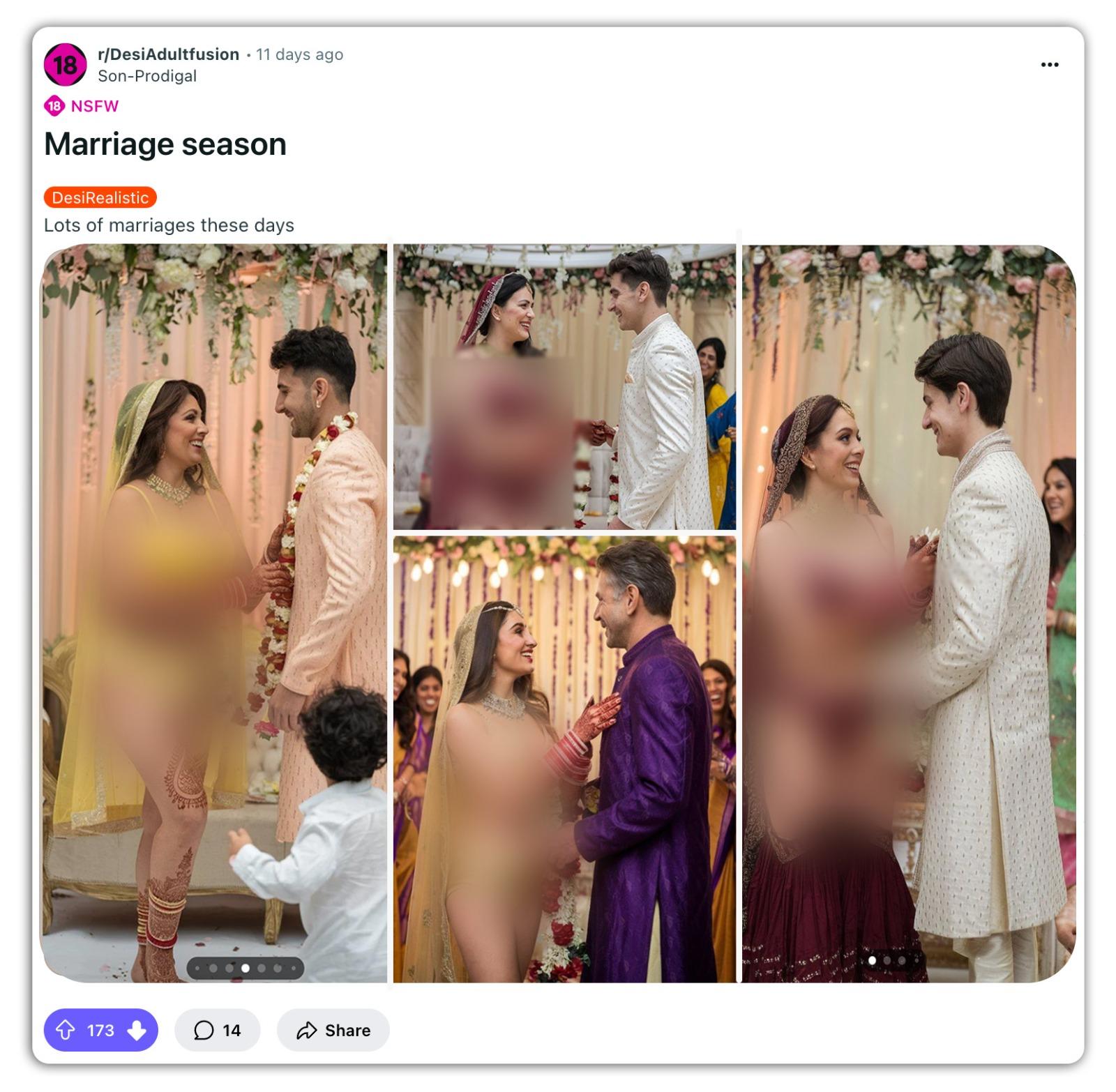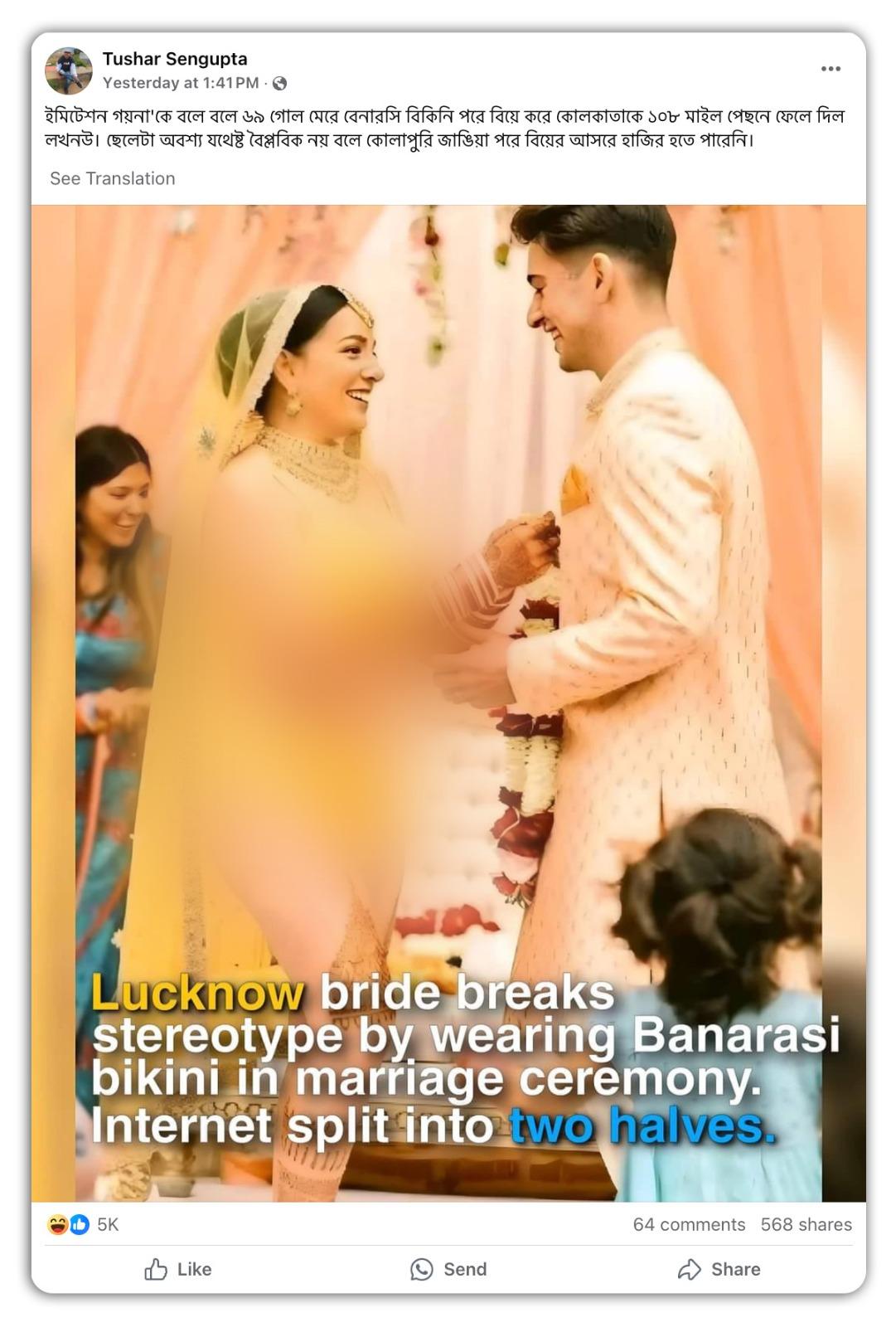 উদাহরণস্বরূপ, এক ফেসবুক ব্যবহারকারী ভাইরাল ছবিটি শেয়ার করে লিখেছেন, “ইমিটেশন গয়না'কে বলে বলে ৬৯ গোল মেরে বেনারসি বিকিনি পরে বিয়ে করে কোলকাতাকে ১০৮ মাইল পেছনে ফেলে দিল লখনউ। ছেলেটা অবশ্য যথেষ্ট বৈপ্লবিক নয় বলে কোলাপুরি জাঙিয়া পরে বিয়ের আসরে হাজির হতে পারেনি।” (সব বানান অপরিবর্তিত।) পাশাপাশি তিনি ছবির উপরে ইংরেজিতে লিখেছেন, “বিয়ের অনুষ্ঠানে বেনারসি বিকিনি পরে স্টেরিওটাইপ ভাঙলেন লখনউয়ের কনে। দুই ভাগে বিভক্ত ইন্টারনেট।”