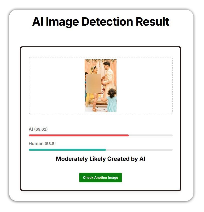 এর থেকে প্রমাণ হয় যে সোশ্যাল মিডিয়ায় কৃত্রিম বুদ্ধিমত্তা বা AI দ্বারা তৈরি একটি ছবি শেয়ার করে দাবি করা হচ্ছে লাখনউতে বিকিনি পরে এক যুবতী বিয়ে করেছেন।