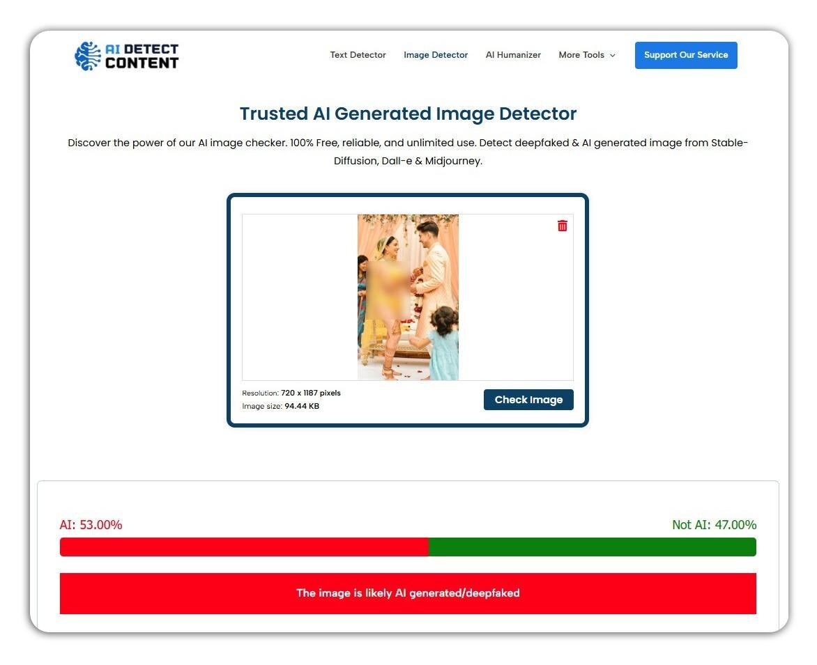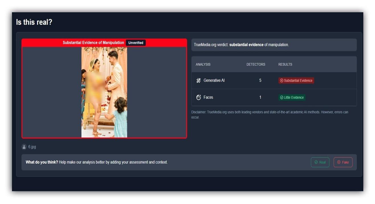 এরপর এ বিষয়ে বিষয়ে ১০০ শতাংশ নিশ্চিত হতে আমরা AI Image Dectector, TrueMedia এবং Ai Detect Content-এর মত AI যাচাইকারী টুলের মাধ্যমে দেখার চেষ্টা করি ভাইরাল ছবিটি সত্যিই AI বা কৃত্রিম বুদ্ধিমত্তা দ্বারা তৈরি করা হয়েছে কিনা। প্রতিটি টুলেই ছবিটিকে AI দ্বারা তৈরি করা হয়েছে বলে চিহ্নিত করেছে। নিচে এইসব ওয়েবসাইট বা টুলের ফলাফল দেখা যাবে।