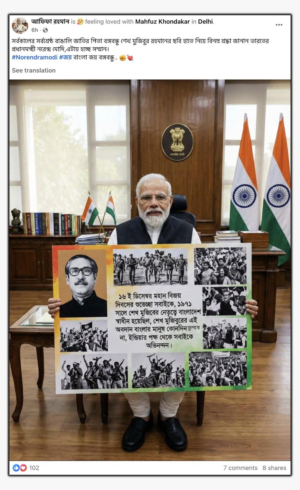 শেখ মুজিবুর রহমানের ছবি সম্বলিত প্ল্যাকার্ড হাতে বাংলাদেশিদের বিজয় দিবসের শুভেচ্ছা জ্ঞাপনের প্রধানমন্ত্রী নরেন্দ্র মোদীর ছবিটি এইআই বা কৃত্রিম বুদ্ধিমত্তা দিয়ে তৈরি।