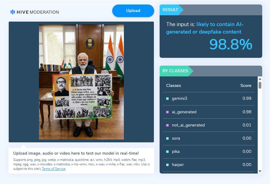 এর থেকে সন্দেহ তৈরি হয় যে প্ল্যাকার্ড হাতে নরেন্দ্র মোদীর তরফে বাংলাদেশিদের বিজয় দিবসের শুভেচ্ছা জ্ঞাপনের ভাইরাল ছবিটি এইআই বা কৃত্রিম বুদ্ধিমত্তা দিয়ে তৈরি করা হতেও পারে। তবে বিষয়টি সম্পর্কে একশো শতাংশ নিশ্চিত হতে এরপর আমরা ভাইরাল ভিডিওটিকে Hive Moderation নামক এআই যাচাইকারী ওয়েবসাইটে পরীক্ষা করি। ওয়েবসাইটি ৯৮.৮ শতাংশ নিশ্চিতভাবে জানিয়েছে যে ভাইরাল ভিডিওটি এআই বা কৃত্রিম বুদ্ধিমত্তার সাহায্যে তৈরি করা হয়েছে।