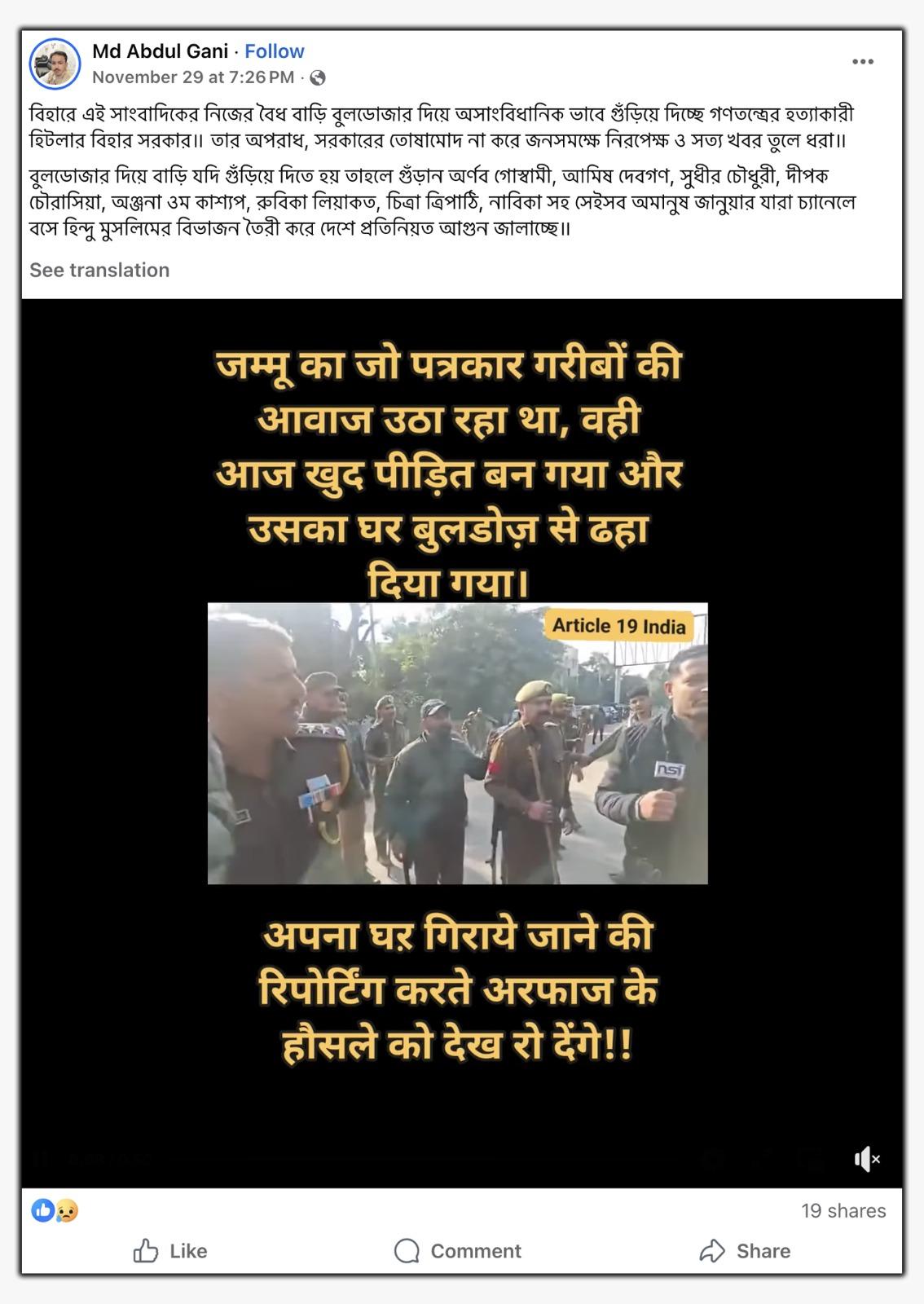 উদাহরণস্বরূপ, এক ফেসবুক ব্যবহারকারী ভাইরাল ভিডিওটি শেয়ার করে লিখেছেন, “বিহারে এই সাংবাদিকের নিজের বৈধ বাড়ি বুলডোজার দিয়ে অসাংবিধানিক ভাবে গুঁড়িয়ে দিচ্ছে গণতন্ত্রের হত্যাকারী হিটলার বিহার সরকার॥ তার অপরাধ, সরকারের তোষামোদ না করে জনসমক্ষে নিরপেক্ষ ও সত্য খবর তুলে ধরা॥” (সব বানান অপরিবর্তিত)