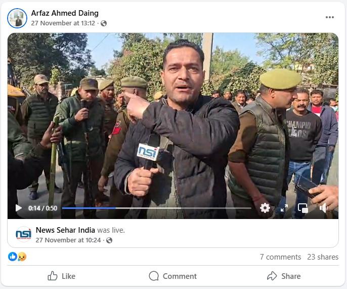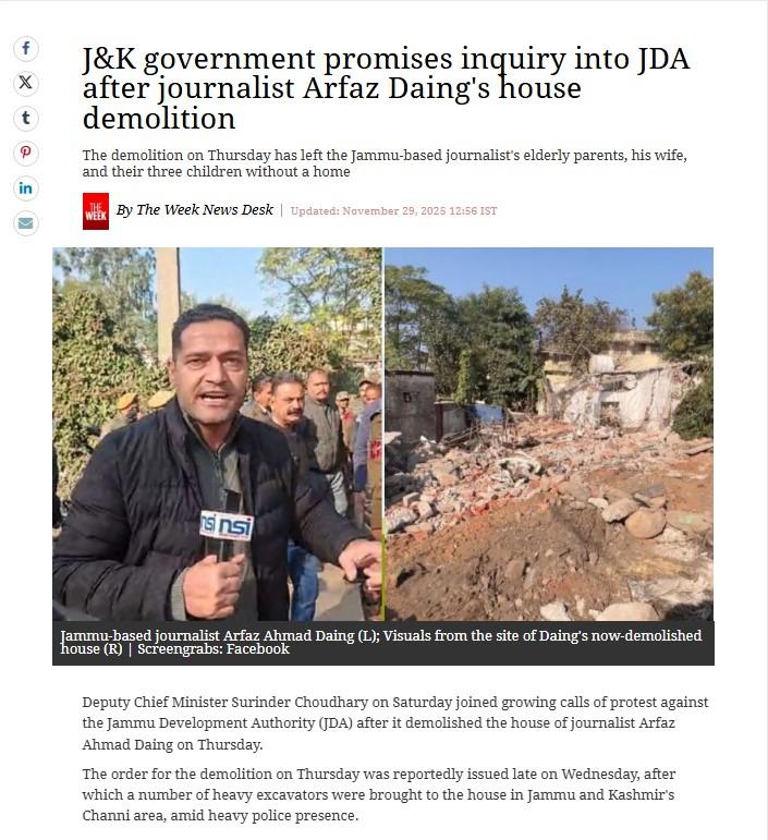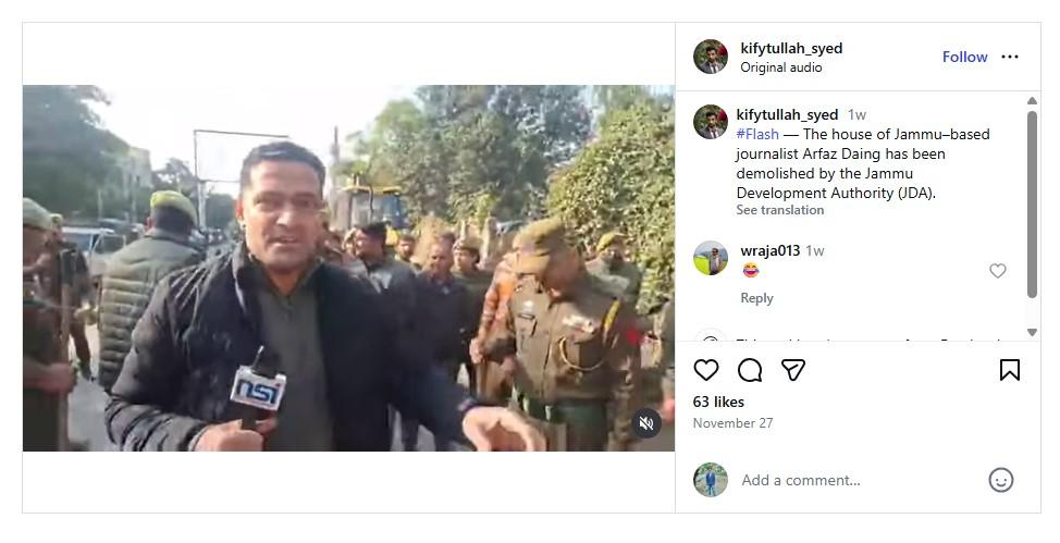 এরপর উক্ত তথ্যের উপরে ভিত্তি করে পরবর্তী অনুসন্ধান চালালে, নিউজ ১৮, এনডিটিভি এবং দ্য উইক-সহ একাধিক সংবাদমাধ্যমে ভাইরাল ভিডিও-র স্ক্রিনশট অথবা ভিডিও-র সাংবাদিকের ছবি-সহ এই সংক্রান্ত প্রতিবেদন পাওয়া যায়। সেই সব প্রতিবেদন থেকে জানা যায়, চলতি বছরের ২৭ নভেম্বর জম্মু ও কাশ্মীরের নারওয়াল এলাকায় জম্মু ডেভেলপমেন্ট অথরিটির জায়গায় তৈরি আরাফাজ আহমেদ দাইং নামক এক সাংবাদিকের পৈতৃক বাড়ি বুলডোজার দিয়ে ভেঙে দেয় প্রশাসন। আরাফাজ আহমেদ দাইং ‘News Sehar India’ নামক একটি অনলাইন পোর্টাল চালান।