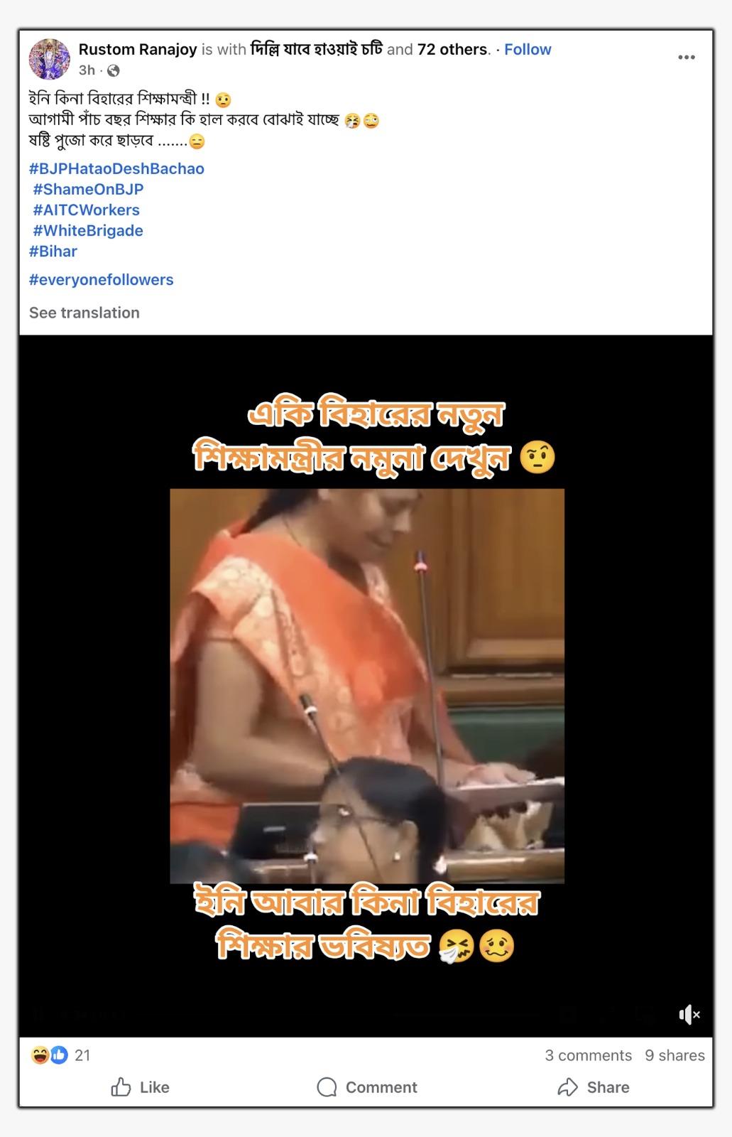 ভিডিওটি শেয়ার করে দাবি করা হচ্ছে, শপথপত্র পাঠ করতে গিয়ে বারবার আটকে যাওয়া এই মহিলা বিধায়ককেই বিহারের শিক্ষামন্ত্রী করা হয়েছে। উদাহরণস্বরূপ, এক ফেসবুক ব্যবহারকারী ভাইরাল ভিডিওটি শেয়ার করে লিখেছেন, “ইনি কিনা বিহারের শিক্ষামন্ত্রী !! আগামী পাঁচ বছর শিক্ষার কি হাল করবে বোঝাই যাচ্ছে, ষষ্টি পুজো করে ছাড়বে।” পাশাপাশি, ভিডিও-র ফ্রেমের উপর লেখা হয়েছে, “একি বিহারের নতুন শিক্ষামন্ত্রীর নমুনা দেখুন, ইনি আবার কিনা বিহারের শিক্ষার ভবিষ্যত।” (সব বানান অপরিবর্তিত)