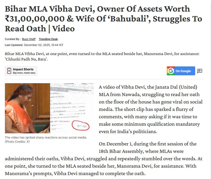 সদ্য সমপ্ত বিহার বিধানসভা নির্বাচনে ব্যাপক সংখ্যাগরিষ্ঠতা পেয়ে দশমবারের জন্য মুখ্যমন্ত্রীর কুরসিতে বসেছেন নীতীশ কুমার। গত ২০ নভেম্বর পাটনার ঐতিহাসিক গান্ধী ময়দানে শপথ গ্রহণ করেন তিনি। তবে এবার সামাজিক যোগাযোগ মাধ্যমে ভাইরাল হয়েছে বিহার বিধানসভায় বিভা দেবী নামক নবনির্বাচিত এক মহিলা বিধায়কের শপথগ্রহণের ভিডিও। যেখানে শপথগ্রহণের সময় তাঁকে বারবার শপথপত্র পড়তে গিয়ে আটকে যেতে দেখা যাচ্ছে।