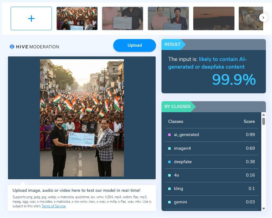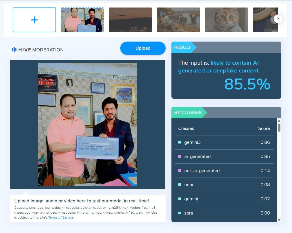 প্রথম ছবি: হুমায়ুন কবীরের সঙ্গে শাহরুখ খানের ছবিটি যাচাই করে Hive Moderation ওয়েবসাইটি ৮৫.৫ শতাংশ নিশ্চিতভাবে জানিয়েছে যে সেটি এআই বা কৃত্রিম বুদ্ধিমত্তার সাহায্যে তৈরি করা হয়েছে।
