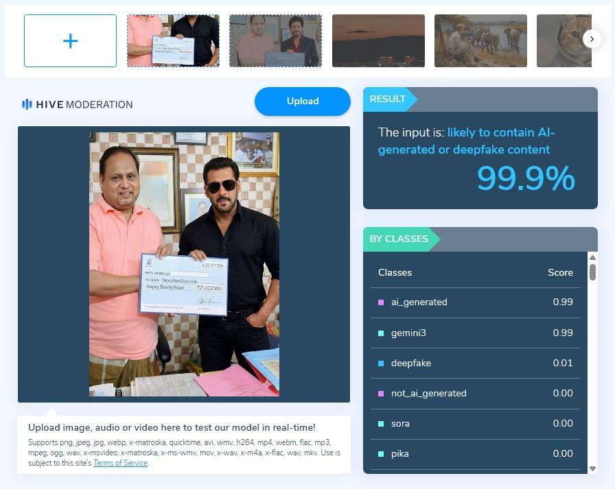 দ্বিতীয় ছবি: হুমায়ুন কবীরের সঙ্গে সলমন খানের ছবিটি যাচাই করে Hive Moderation ওয়েবসাইটি ৯৯.৯ শতাংশ নিশ্চিতভাবে জানিয়েছে যে সেটিও এআই বা কৃত্রিম বুদ্ধিমত্তার সাহায্যে তৈরি করা হয়েছে।