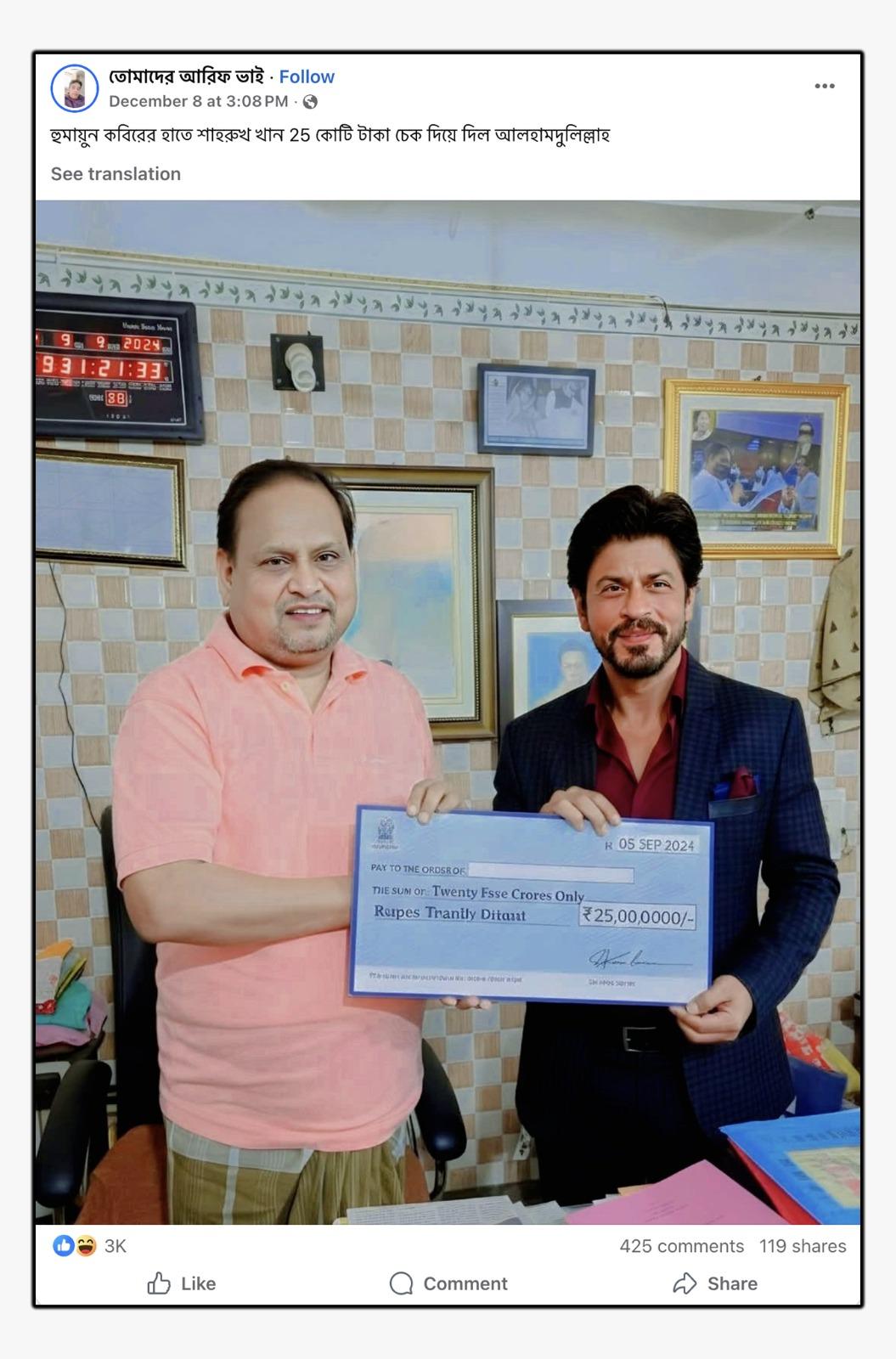 যেমন, প্রথম ছবিতে হুমায়ুন কবীরের দফতরে উপস্থিত হয়ে তাঁর হাতে একটি চেক তুলে দিতে দেখা যাচ্ছে বলিউড অভিনেতা শাহরুখ খানকে। ছবিটি শেয়ার করে এক ফেসবুক ব্যবহারকারী লিখেছেন, “হুমায়ুন কবিরের হাতে শাহরুখ খান 25 কোটি টাকা চেক দিয়ে দিল আলহামদুলিল্লাহ।” (সব বানান অপরিবর্তিত)