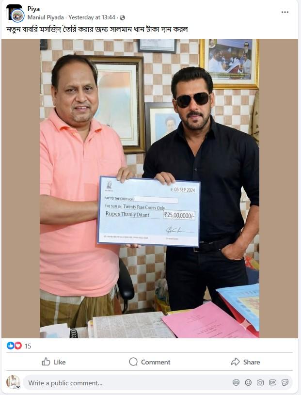 দ্বিতীয় ছবিতে হুমায়ুনের দফতরে উপস্থিত হয়ে তাঁর হাতে চেক তুলে দিতে দেখা যাচ্ছে বলিউড অভিনেতা সলমন খানকে। ছবিটি শেয়ার করে এক ফেসবুক ব্যবহারকারী লিখেছেন, “নতুন বাবরি মসজিদ তৈরি করার জন্য সালমান খান টাকা দান করল।” (সব বানান অপরিবর্তিত)
