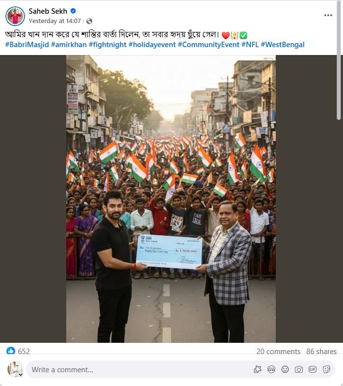 অন্যদিকে, একইভাবে তৃতীয় ছবিতে ভারতের পতাকা হাতে দাঁড়িয়ে থাকা শতশত মানুষের সামনে হুমায়ুনের হাতে একটি চেক তুলে দিচ্ছেন মিস্টার পারফেকশনিস্ট আমির খান। ছবিটি শেয়ার করে এক ফেসবুক ব্যবহারকারী লিখেছেন, “আমির খান দান করে যে শান্তির বার্তা দিলেন, তা সবার হৃদয় ছুঁয়ে গেল। #BabriMasjid #amirkhan” (সব বানান অপরিবর্তিত)
