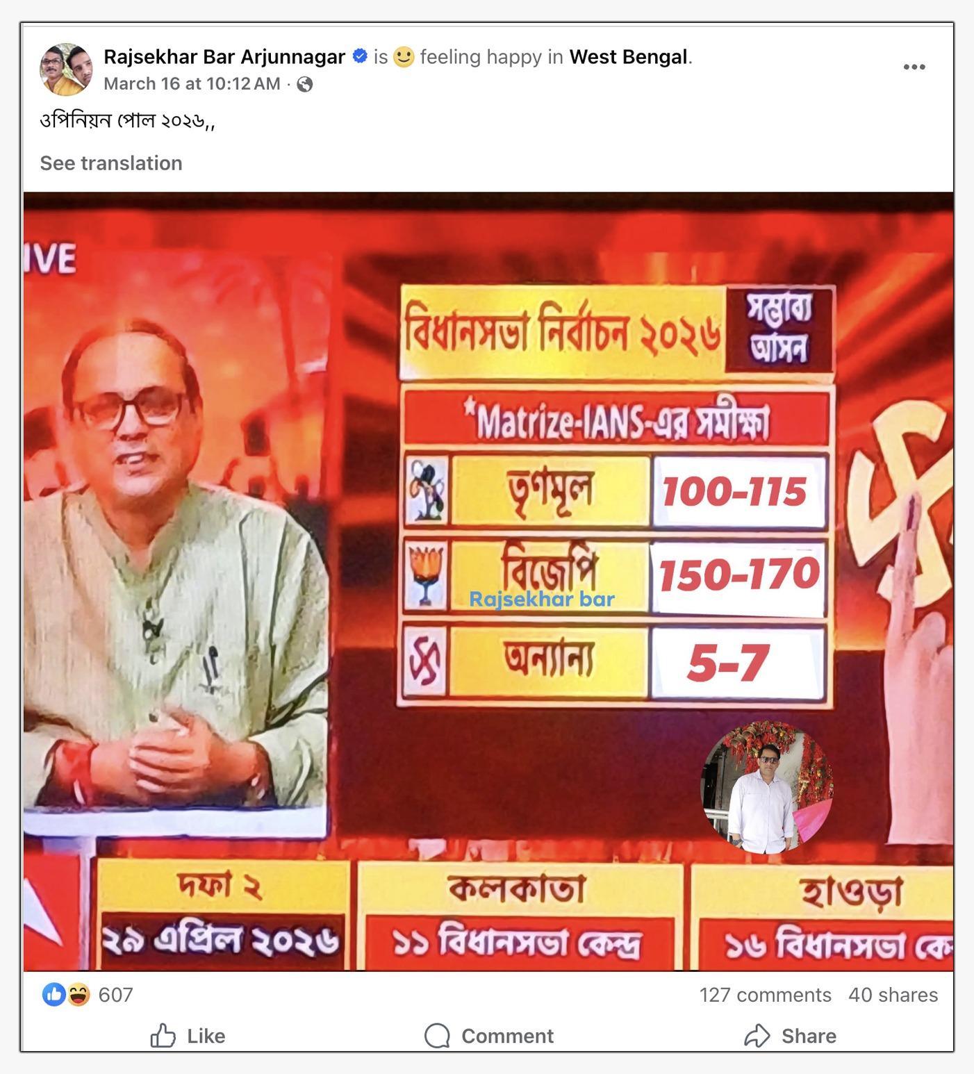 সেই সমীক্ষায় ২০২৬ সালের পশ্চিমবঙ্গ বিধানসভা নির্বাচনে বিজেপি ১৫০-১৭০ এবং তৃণমূল কংগ্রেস ১০০-১১৫টি আসনে জয়লাভ করবে বলে পূর্বাভাস দেওয়া হয়েছে। ভাইরাল ওপিনিয়ন পোলের স্ক্রিনশটটি শেয়ার করে দাবি করা হচ্ছে, এবিপি আনন্দের করা এই পোল অনুযায়ী আসন্ন ২০২৬ সালের পশ্চিমবঙ্গ বিধানসভা নির্বাচনে ১৫০-১৭০ আসন পাওয়ার সম্ভাবনা রয়েছে বিজেপি। উদাহরণস্বরূপ, ভাইরাল জনমত সমীক্ষার স্ক্রিনশটটি শেয়ার করে এক ফেসবুক ব্যবহারকারী লিখেছেন, “আগামী 4 মে গেরুয়া আবীর খেলা হবে, জয় শ্রী রাম।”