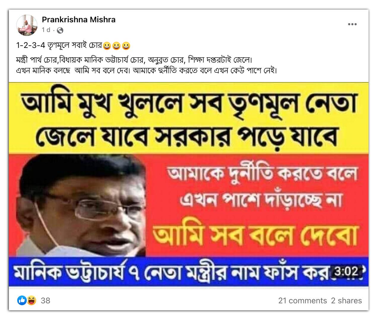 স্ক্রিনশটটি শেয়ার করে একজন লিখেছেন, "মন্ত্রী পার্থ চোর,বিধায়ক মানিক ভট্টাচার্য চোর, অনুব্রত চোর,শিক্ষা দপ্তরটাই জেলে। এখন মানিক বলছে আমি সব বলে দেব। আমাকে দুর্নীতি করতে বলে এখন কেউ পাশে নেই।" (পোস্টটির বানান অপরিবর্তন করা হয়নি)। পোস্টের আর্কাইভ লিঙ্কটিও দেওয়া হল।