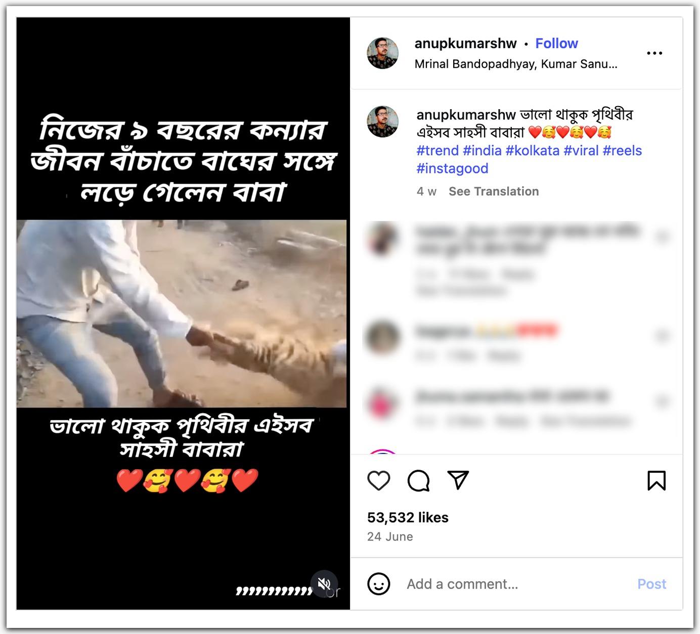 ইনস্টাগ্রাম ও ফেসবুকে এই ভিডিওটি অনেকেই শেয়ার করে লিখেছেন, নিজের ৯ বছরের কন্যার জীবন বাঁচাতে বাঘের সঙ্গে লড়ে গেলেন বাবা। ভালো থাকুক পৃথিবীর এইসব সাহসী বাবারা।