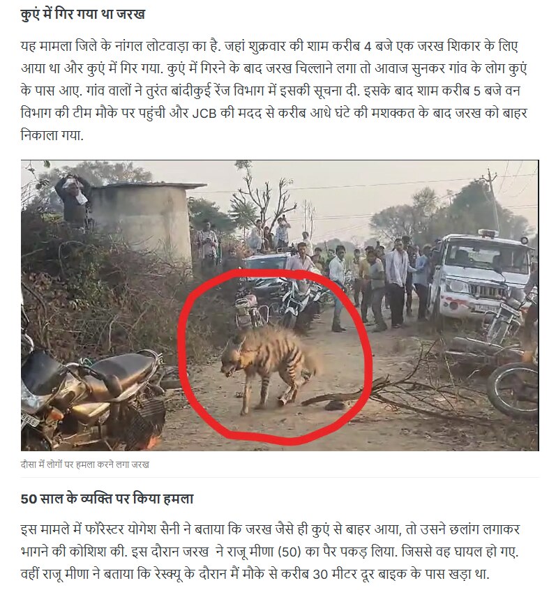 এরপর চিৎকার শুনে এলাকাবাসীরা হায়নাটি উদ্ধার করতে এগিয়ে আসে। বন দফতরকেও খবর দেওয়া হয়। বন দফতরের কর্মীরা ঘটনাস্থলে পৌঁছে জেসিবির সাহায্যে হায়নাটিকে উদ্ধার করেন। উদ্ধার হওয়ার সঙ্গে সঙ্গে হায়নাটি পালানোর চেষ্টা করে এবং ঘটনাস্থলে দাঁড়িয়ে থাকা রাজু মীনা নামের এক ব্যক্তির পা ধরে নেয়। মুহূর্তের মধ্যেই গ্রামবাসীরা এগিয়ে আসেন এবং রাজু মীনাকে উদ্ধার করেন। তবে এখানে কোনও রিপোর্টেই লেখা হয়নি যে ঘটনাস্থলে রাজু মীনার কন্যা বা অন্য কোনও মহিলা আহত হয়েছেন।