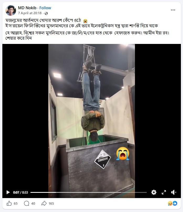 ভিডিওটি শেয়ার করে দাবি করা হচ্ছে, ইজরায়েল প্রশাসন একজন প্যালেস্তাইন নাগরিকের হাত-পা বেঁধে উল্টো করে ঝুলিয়ে ইলেকট্রিক শক দিয়ে নির্যাতন করেছে। উদাহরণস্বরূপ, ভাইরাল ভিডিওটি শেয়ার করে এক ফেসবুক ব্যবহারকারী লিখেছেন, “ইন্না লিল্লাহ! মজলুমের আর্তনাদে খোদার আরশ কেঁপে ওঠে। ই'স'রায়েল ফি'লি'স্তিনের মুসলমানদের কে এই ভাবে ইলেকট্রনিকস যন্ত্র দ্বারা শা*স্তি দিয়ে থাকে হে আল্লাহ, বিশ্বের সকল মুসলিমদের কে জা/লি/ম/দের হাত থেকে হেফাজত করুন। আমীন ইয়া রব।”