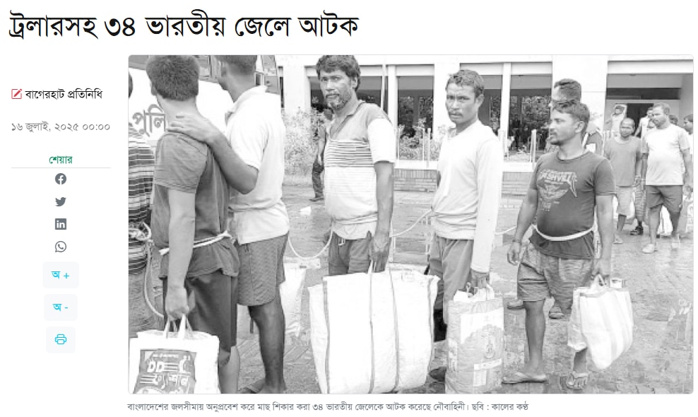 সেই খবরে লেখা হয়, বাংলাদেশের অনুপ্রবেশ করার অভিযোগে মোট ৩৪ জন ভারতীয় মৎসজীবীকে গত ১৪ জুলাই আটক করেছিল বাংলাদেশের নৌসেনা। ‘এফবি ঝড়’ ও ‘এফবি মঙ্গল চণ্ডি-৩৮’ নামের দুটি মাছ ধরার ট্রলার-সহ এই ৩৪ জন জেলেকে বঙ্গোপসাগরে ফেয়ারওয়ে বয়া সংলগ্ন গভীর সাগর থেকে আটক করা হয়।