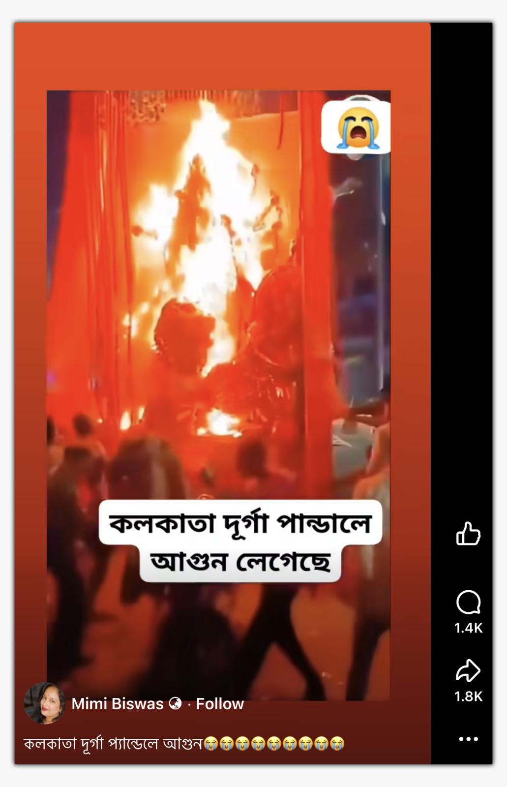 দুর্গাপুজো চলাকালীন সোশ্যাল মিডিয়ায় মা দুর্গার প্রতিমায় আগুন লাগার একটি ভিডিও ছড়িয়ে পড়ে। ভিডিওটি শেয়ার করে দাবি করা হয় যে ঘটনা কলকাতার, যেখানে কোনও পুজো মণ্ডপে আগুন লেগে গিয়েছে।
